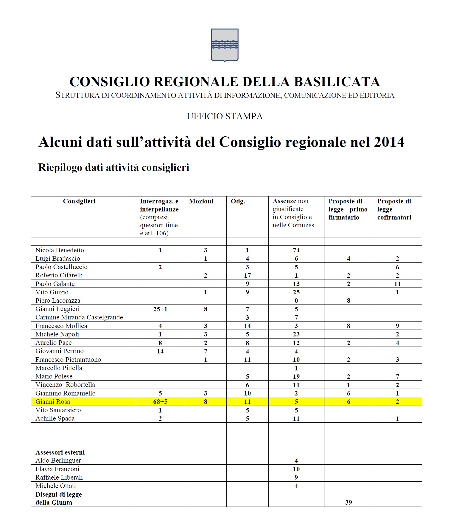 CONSIGLIO REGIONALE DI BASILICATA DATI SULL’ATTIVITÀ DEL CONSIGLIO REGIONALE NEL 2014 |
