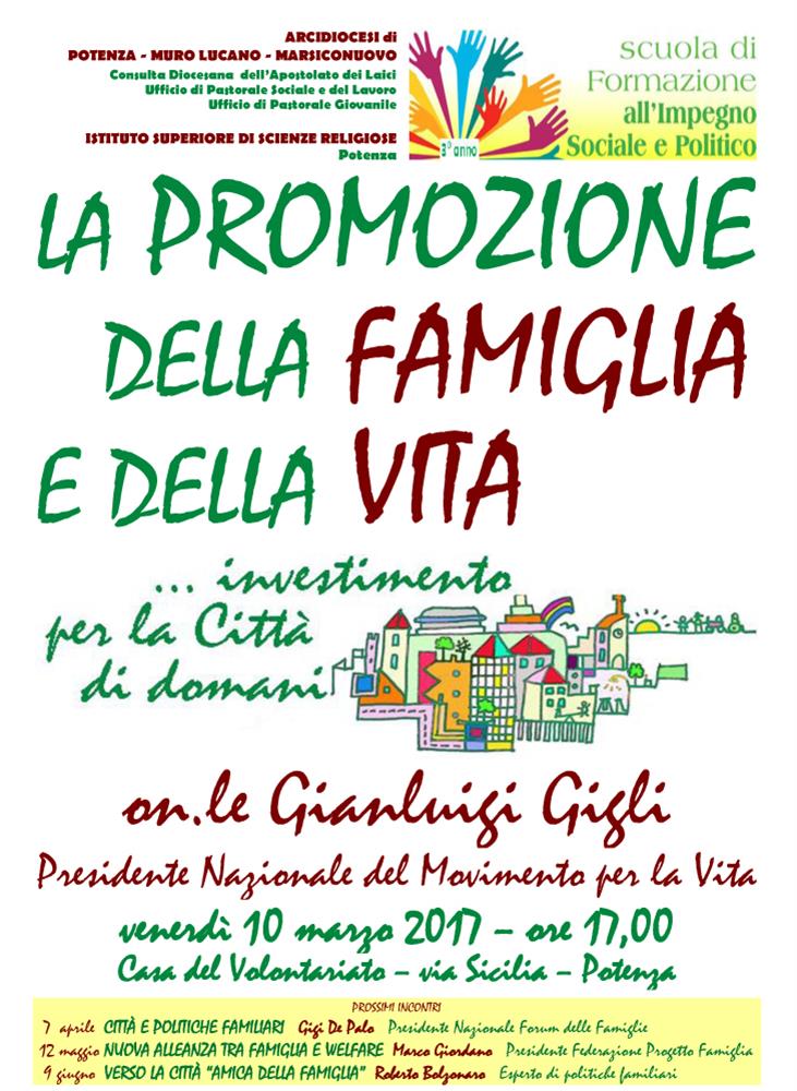 L’iniziativa, promossa dalla Consulta del Laicato, dall’Ufficio di Pastorale Sociale e del Lavoro e dal Servizio di Pastorale Giovanile della Arcidiocesi di Potenza, si terrà presso la Casa del Volontariato, in via Sicilia (ex IPIAS) venerdì 10 marzo 2017, con inizio alle ore17:00. Dopo i saluti di s.e. Salvatore Ligorio Arcivescovo di Potenza, e del Vicesindaco della città dott. Sergio Potenza, la relazione sarà svolta dall’on.le Gianluigi Gigli, Deputato della Repubblica, Psichiatra e titolare della cattedra di Neurologia presso l’Università di Udine, già membro del Pontificio Consiglio per la Vita e la Famiglia ed attualmente Presidente nazionale del Movimento per la Vita. Nel corso dell’incontro sarà messa in evidenza la scarsa efficacia delle politiche familiari approvate a livello nazionale, e si discuterà dello "strabismo" culturale e politico che lascia in latenza i temi della famiglia e della vita quando si approvano norme e leggi di bilancio, con l’inevitabile indebolimento della cellula fondante della convivenza umana e l’implosione demografica che mette a rischio il futuro stesso della società. Eppure non vi è chi non veda la simbiosi strettissima che lega famiglia e società, per cui le problematiche e le disfunzioni che interessano l’una, inevitabilmente si riversano sulla seconda, in una spirale che alimenta l’instabilità nelle relazioni, le difficoltà ad accogliere ed accudire la vita, la mancanza di validi modelli educativi, la carenza di dialogo, l’esasperazione dei conflitti, l’insicurezza economica, la paura del futuro. Il relatore si soffermerà anche sul ruolo che può svolgere la città davanti all'evidente, programmata disattenzione dello Stato centrale, e sul contributo che possono offrire in proposito le associazioni ecclesiali e di volontariato, chiamate a mettersi insieme, ad avere una sola voce, ed a fare massa critica, al fine di chiamare le istituzioni ad un nuovo impegno sui temi che stanno a cuore alla famiglia e alla vita. |