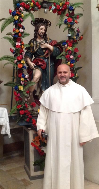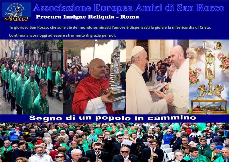 Il 20 MAGGIO ci ritroveremo con gioia tutti nuovamente assieme nella comunità di RUOTI PZ che quest'anno ospiterà il nostro consult appuntamento di fede , spiritualità , preghiera e genuina devozione al caro San Rocco che è giunto al diciottesimo anno . La nostra gratitudine va a Dio Padre per i suoi infiniti doni che compie in ognuno di noi , donandoci questi campioni della fede che prendendoci per mano ci guidano senza sosta a Gesù Via , Verità e Luce . Mel Giubileo della Misericordia Papa Francesco ha invitato a riscoprire i Santi della Misericordia; cioè quei santi che furono operatori di misericordia. Tra questi occupa un posto ben visibile San Rocco di Montpellier, molto venerato in Italia. Egli visse in mezzo agli appestati; fece come il Signore Gesù che si è caricato delle nostre sofferenze, si è addossato i nostri dolori”. (cf Is, 53, 4). Vogliamo con cuore amico esortare a partecipare tutte le comunità dove è presente il culto a San Rocco in Italia , le parrocchie , i Santuari , le confraternite , le comunità , i comitati feste e i devoti del Santo . I signori Sindaci e le amministrazioni comunali dove San Rocco e il patrono ,compatrono , protettore o venerato . Perché assieme si possa vivere e tracciare un cammino di vera comunione sotto lo sguardo del caro San Rocco che accumuna molti di noi nella sua devozione. La venerazione verso San Rocco carissimi ci permette di guardare con occhi diversi alle nostre storie personali e comunitarie . Le vogliamo vedere con gli occhi di Gesù , come le potrebbe vedere San Rocco . Amici e devoti di San Rocco se il cammino si fa da soli , restano solo previsioni o sogni , se lo faremo assieme può diventare realtà , se lo facciamo con Gesù come San Rocco , ci riempirà la vita di felicità . Vi aspettiamo tutti con rinnovato affetto nella bella ed accogliente comunità di RUOTI PZ per vivere assieme le meraviglie del Signore che ha compiuto in San Rocco . |