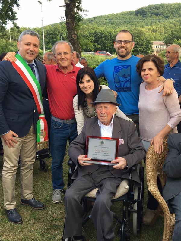 | Il Sindaco di Avigliano, dott. Vito Summa, alla presenza di familiari, amici e conoscenti, ha espresso le felicitazioni, proprie e a nome dell’intera comunità, al concittadino Vincenzo SABIA residente a Torretta, che ieri ha compiuto cento anni, consegnandogli, di persona, una targa ricordo per la lieta ricorrenza.