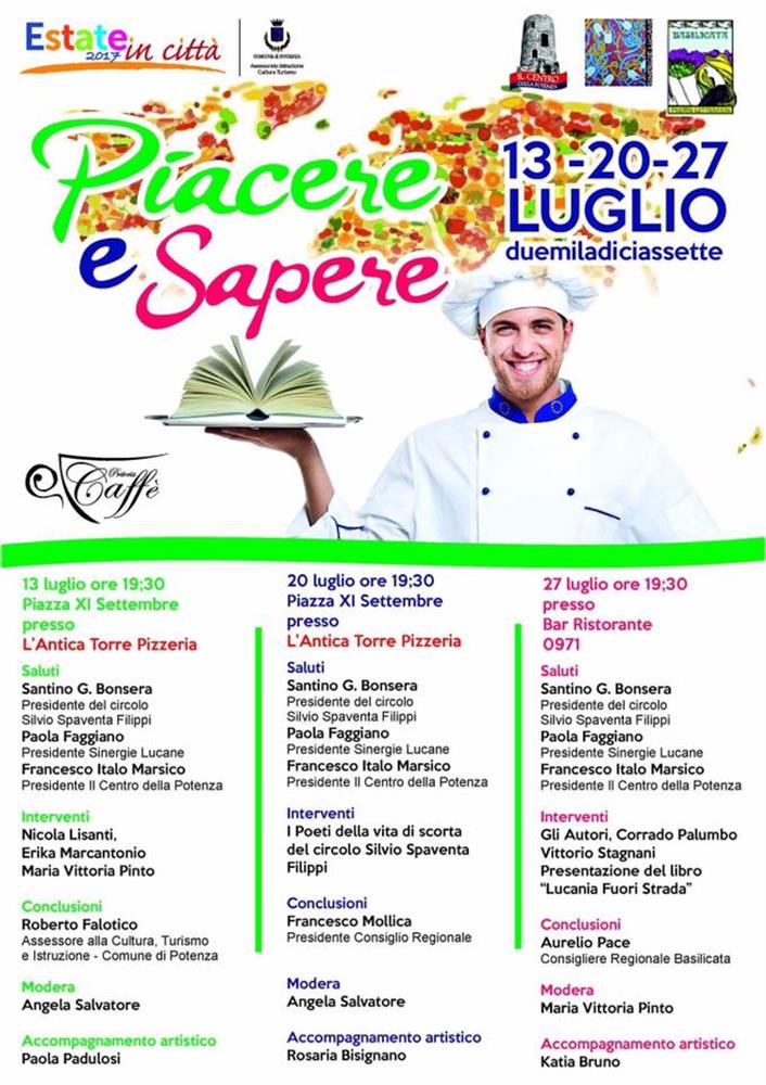 | “Piacere e sapere” è il titolo del secondo appuntamento culturale organizzato dall’associazione Sinergie Lucane in collaborazione con il Circolo Silvio Spaventa Filippi nell’ambito dell’Estate 2017 in Città. Giovedì 20 luglio alle 19.30 a Potenza in Piazza XI Settembre, presso la pizzeria l’Antica Torre, i “Poeti della vita di scorta” del Circolo Silvio Spaventa Filippi leggeranno alcuni componimenti editi e inediti su argomenti vari.