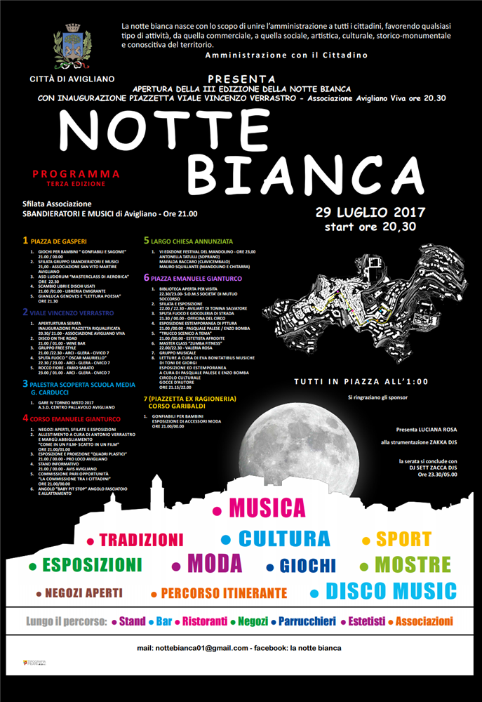 | Al via domani, 29 luglio 2017, la III edizione de “La Notte Bianca”, organizzata dall’Amministrazione con i cittadini.