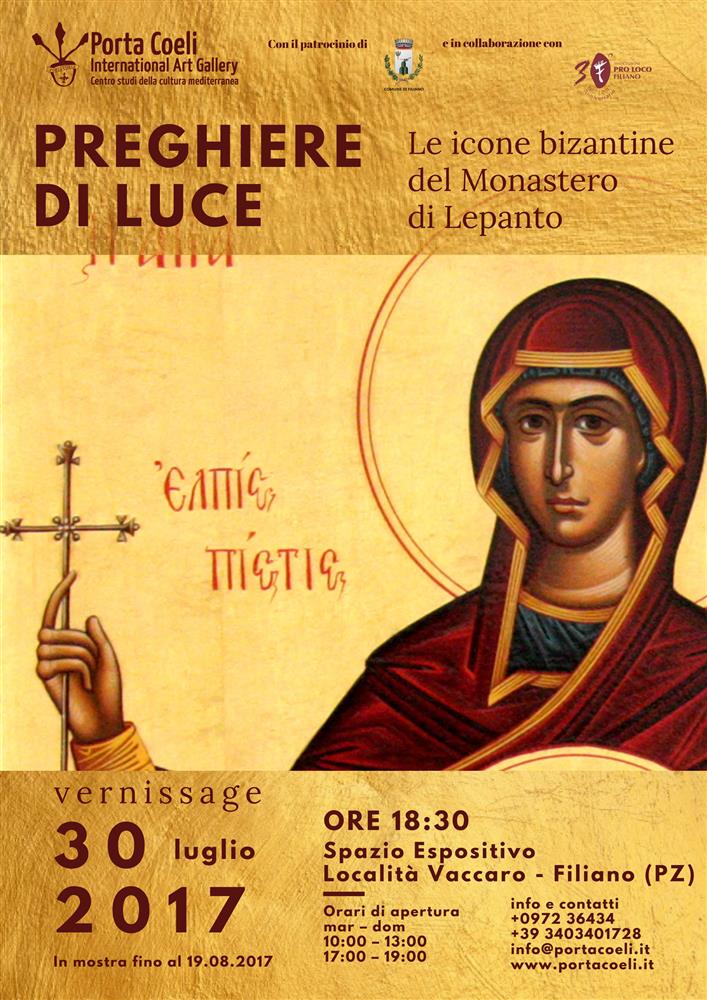 L’inaugurazione della mostra intitolata “Preghiere di luce” avrà luogo il 30 luglio 2017 alle ore 18:30 presso lo Spazio espositivo in località Vaccaro a Filiano. L’evento è organizzato da Porta Coeli International Art Gallery in collaborazione con la Pro Loco di Filiano e sotto il patrocinio morale del Comune di Filiano. I visitatori potranno ammirare opere uniche certificate frutto di una esclusiva mondiale. Sin dal 2012, infatti, il Monastero di Lepanto, massima scuola di produzione iconografica mondiale, riserva a Porta Coeli l’esclusiva nella esposizione e promozione. La mostra prevede due sezioni: Le icone di Lepanto e Le icone di Gustavo Luis Costanzo. In sette anni di attività Porta Coeli ha realizzato oltre 40 allestimenti di personali e collettive in Italia e all’estero, curando oltre 100 artisti internazionali. Il suo direttore Aniello Ertico è selezionatore e membro del comitato di Selezione artistico della Biennale d’arte contemporanea di Firenze, con competenza per l’intero mezzogiorno d’Italia, Medioriente e Grecia. L’inaugurazione sarà presieduta dal sindaco di Filiano Francesco Santoro alla presenza della Vicepresidente della Pro Loco di Filiano Donatella Oppido. Sono previsti gli interventi di Antonio Saluzzi, Responsabile della Sezione d’arte sacra Porta Coeli International Art Gallery, e di Aniello Ertico, Direttore di Porta Coeli International Art Gallery. Le conclusioni sono affidate al Consigliere regionale Aurelio Pace. Modera l’incontro Vito Sabia della Pro Loco Filiano. Porta Coeli, riconoscendo nella realizzazione di reti collaborative virtuose una strategia essenziale per essere credibili nel complesso mondo della produzione e promozione culturale, ha eletto la Pro Loco di Filiano quale riferimento essenziale e privilegiato, attribuendogli il merito di una notevole esperienza acquisita nell’ambito della valorizzazione umanistica attraverso iniziative culturale di sempre crescente qualità. La mostra delle opere, dopo l’inaugurazione, potrà essere visitata con ingresso gratuito dal martedì alla domenica dalle ore 10:00 alle 13:00 e dalle 17:00 alle ore 19:00. |