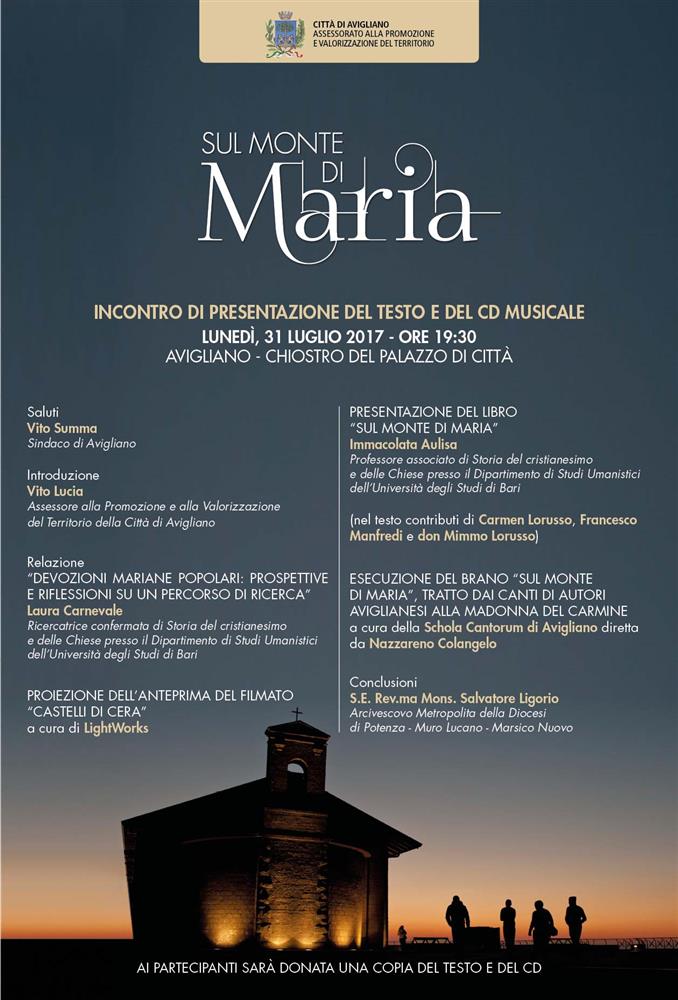 | Si terrà Lunedì 31 Luglio, alle ore 19:30, nel Chiostro del Palazzo di Città, l'incontro di presentazione del testo e del cd musicale "Sul Monte di Maria", realizzati all'interno del progetto "La Madonna del Carmine e i Cinti”, candidato dal Comune di Avigliano e finanziato dalla Regione Basilicata. La pubblicazione, infatti, è stata resa possibile grazie ai fondi PO-FESR per la promozione dell’insieme delle risorse culturali e naturali della Regione, che ha incluso il presente volume negli strumenti utili alla valorizzazione del patrimonio intangibile, elemento essenziale dell’identità lucana.