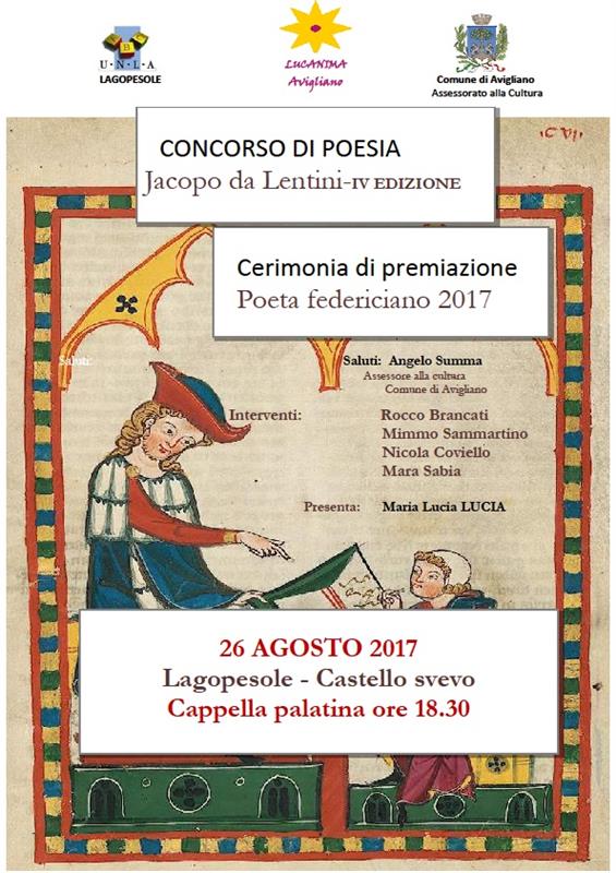 La giuria ha selezionato la sua poesia “Una ballata per il corpo” tra circa 40 composizioni poetiche suddivise in quattro sezioni: poesia a tema libero, sonetto a tema amoroso, haiku e giovani poeti. La motivazione della giuria “per l’originalità del verso, delle strutture e per i rimandi a una poesia che riesce a coniugare la dimensione giocosa con la profondità di immagini e di pensiero”. Alice Bologna vince il titolo di “poeta federiciano 2017”. Secondo classificato Antonio Cirillo di Barga in provincia di Lucca con il sonetto “Anniversario di settembre” e terzo classificato Valerio Cascini di Torino con la poesia a tema libero “Stagioni”. Menzioni della giuria a Massimiliano Testa di Lariano in provincia di Roma con la poesia a tema libero “Mare”, Barbara Tascone di Milano con la poesia a tema libero “Bosco verticale”, Nicolò Zatta di Maserà in provincia di Padova con la poesia “Mi sono seduto sul bordo del mare”. Nella categoria giovani poeti hanno ricevuto menzione Federico Orsini di Legnano con la poesia “Immagine di Gesù misericordioso” e Enrico Barbieri di Modena con la poesia “Il sole”. La cerimonia di premiazione si terrà sabato 26 agosto 2017, alle ore 18,30, nella Cappella Palatina del Castello federiciano di Lagopesole. Tra i tanti premi di poesia che ogni anno si svolgono in Italia questo di Lagopesole riserva di caccia dell’Imperatore Federico II di Svevia “stupor mundi” intende richiamarsi alla figura di Jacopo da Lentini (1210-1260) che fu uno dei principali esponenti della “scuola siciliana”e considerato l’ideatore del sonetto. Un’ultima annotazione la giuria è composta da: Mara Sabia, Mimmo Sammartino, Rocco Brancati, Nicola Coviello. |