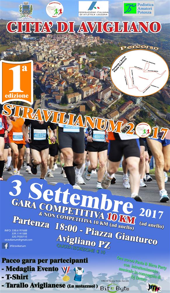 | Tutto pronto per la I edizione della "STRAVILIANUM 2017" la gara podistica competitiva e non competitiva di 10 km che si svolgerà per le vie cittadine di Avigliano con Partenza alle ore 18:00. A comunicarlo l'assessore allo sport del comune di Avigliano Angelo Summa. Sarà un bel pomeriggio di sport e di comunità-dichiara l'assessore-che vedrà presenti tanti atleti agonisti iscritti alle associazioni podistiche lucane ma anche tanti appassionati dello sport e del vivere sano. La nostra amministrazione-continua l'assessore-ha sempre avuto uno sguardo attento allo sport come forma educativa e sociale in particolare nei confronti dei ragazzi e dei più piccoli della nostra comunità. Con la nascente associazione podistica avigliano, che ringrazio, in particolare Daniele Pietrafesa e Franco Masi per la preziosa e insostituibile collaborazione e competenza e unitamente all'associazione podistica amatori potenza abbiamo immaginato di rendere protagonisti i tanti podisti aviglianesi attraverso l'organizzazione della STRAVILIANUM.È anche un modo-continua l'assessore-per coinvolgere e rendere partecipe i nostri concittadini che invitiamo a vivere insieme agli atleti questo bel momento sportivo, tifando per loro, sostenendoli e partecipando alla festa finale che si terrà in piazza Gianturco a partire dalle 20:30. Infine un ringraziamento al corpo di polizia locale di Avigliano e alla protezione civile per la competenza e la disponibilità messa in campo non solo in questa occasione ma nelle tante manifestazioni estive del nostro comune.