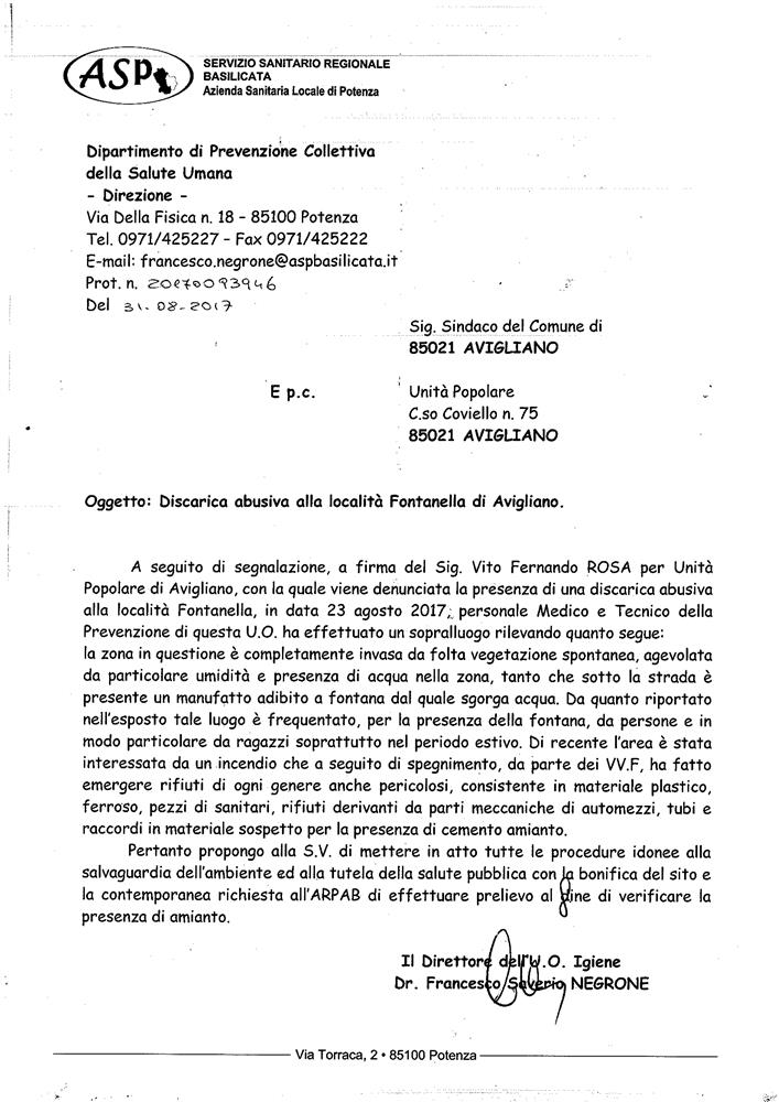 LA COPIA DELLA RISPOSTA DEL DIPARTIMENTO PREVENZIONE DELL' ASP ALLA DENUNCIA DI UNITÀ POPOLARE SULLA DISCARICA IN LOCALITÀ FONTANELLA, IN CUI SI DICE AL SINDACO DI BONIFICARE IL SITO |