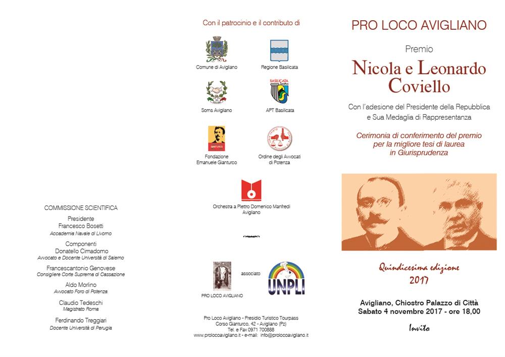 | Si rinnova oggi 4 novembre l’appuntamento con il Premio Coviello organizzato dalla Pro Loco di Avigliano. E’ giunto alla quindicesima edizione, il premio giuridico nazionale dedicato alla memoria di due illustri esponenti della comunità giuridica aviglianese: i fratelli Nicola e Leonardo Coviello. L’importante riconoscimento viene ogni anno attribuito a giovani laureati in materie giuridiche nati o residenti in Basilicata o che siano stati residenti in Regione per almeno tre anni. Dopo l’apertura del bando nella scorsa primavera e la conclusione dell’iter di disamina dei lavori pervenuti, è giunto il momento di procedere alla cerimonia di premiazione prevista per stasera 4 novembre alle ore 18.00 presso il Chiostro del Palazzo di Città di Avigliano. Oltre alla cerimonia di premiazione, preceduta dalla lettura delle motivazioni da parte del Presidente della Commissione Scientifica del Premio, professor Francesco Bosetti ordinario presso l’Accademia Navale di Livorno, la serata sarà arricchita dalla relazione della dott.ssa Domenica Antonietta Summa che illustrerà gli esiti del suo lavoro di ricerca sui diari di Remigia Guariglia moglie di Emanuele Gianturco, altro illustre esponente del panorama giuridico aviglianese. Gli intermezzi musicali saranno invece curati dall’orchestra a plettro “D. Manfredi” di Avigliano che eseguirà pezzi di alcune delle più importanti composizioni gianturchiane. La Pro Loco di Avigliano-dichiara la presidente Carmen Salvatore- con orgoglio rivendica l’istituzione del premio giuridico altro fiore all’occhiello del suo programma annuale. Si tratta di una manifestazione molto sentita dalla comunità e dalle istituzioni locali oltre che dall’intero mondo associativo aviglianese. Sarà una bella serata anche grazie al contributo dei tanti che hanno voluto, ciascuno per la sua parte, contribuire alla organizzazione dell’evento. Ringrazio l’Amministrazione comunale e gli uffici per il continuo supporto e la donazione delle pubblicazioni per i vincitori, la Fondazione Gianturco, la Società Operaia di Mutuo Soccorso e l’orchestra a plettro “D.Manfredi” di Avigliano che con grande entusiasmo ha accolto il nostro invito ad arricchire la serata con le musiche di Gianturco. Infine un ringraziamento particolare ai membri della Commissione Scientifica del Premio, i giudici Genovese e Tedeschi, i professori Treggiari e Bosetti e gli avvocati Morlino e Cimadomo che con grande slancio e generosità consentono a questo premio di continuare ad esistere e a crescere. Senza la loro abnegazione tutto questo non sarebbe possibile. Il segreto della longevità del premio- conclude la presidente- è senza dubbio questo: passione per il proprio lavoro, attenzione per le giovani generazioni e l’orgoglio di una intera comunità che sa stringersi intorno al suo illustre patrimonio di saperi e tradizioni per custodirle e tramandarle ai posteri. |