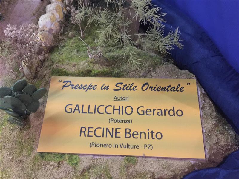 Già lo scorso dicembre 2016, in occasione della Festa del Natale, fu presentata un’anteprima di quest’opera, dell’estensione di 10 metri quadri. Quest’anno, l’iniziale progetto è stato completato, e interesserà una superficie di venti metri quadrati, sarà allestito su un palcoscenico con quinte, completo di una dettagliata e particolare scenografia. Per l’originalità del suo stile, ad oggi, sembra essere l’unica esposizione di questo genere in Basilicata. Per la realizzazione del “Presepe in Stile Orientale”, che si distingue dalla scuola denominata “Presepe Popolare”, i due maestri presepisti Gallicchio e Recine hanno seguito i dettami di alcuni passi del Vangelo e le notizie giunte fino ai nostri tempi, tratte dalla storia della vita in Palestina ai tempi di Gesù. Attenendosi il più possibile a queste informazioni, i due artisti hanno dato vita a questa realizzazione in un’ ambientazione tipica dei luoghi dove è avvenuta la nascita di Gesù. Pertanto si potranno ammirare: una porzione di un tipico villaggio palestinese con case bianche di forma cubica, dove la vita scorre lenta tra i banchi di un mercato, mentre, in prossimità di un tempio, alcuni soldati romani sono intenti a controllare, che tutto sia sotto la loro supervisione, ma in realtà, sfugge ai loro occhi l’importante “Evento” della nascita del “Salvatore”, in una grotta lontana, visitato solo da umili pastori che bivaccano sotto le loro tipiche tende arabe, in prossimità di un oasi. Per la realizzazione dell’opera sono stati utilizzati per l’80% materiali di riciclo. Ad eccezione delle statuine, tutto il resto della scenografia è stato realizzato interamente a mano dai due presepisti che hanno completato l’opera in 24 mesi con oltre 600 ore di lavoro. Il loro impegno è stato totalmente gratuito. Sarà possibile visitare l’esposizione, dal 15 Dicembre 2017 al 14 Gennaio 2018 durante l’orario di apertura della Chiesa. “Come in tutte le creazioni artistiche - ha dichiarato il parroco, don Giuseppe Cacosso - si coglie l’aspirazione alla perfezione, l’anelito al Trascendente e l’ansia di infinito, che poi si traducono nei valori del Vero, del Bello e del Bene, tipici dell’arte. I nostri amici, Recine Benito Gerardo Gallicchio, sono riusciti in questo intento a trasmetterci la bellezza di un'opera che ci conduce a contemplare il Dio Bambino. A loro il ringraziamento più sentito di tutta la comunità parrocchiale e Rionerese per averci regalato uno scorcio di vita che trapassa la storia, i luoghi e il tempo, per un tuffo fantasioso nella terra di Gesù e rivivere così i giorni della sua nascita al mondo.” Il Presepe in Stile Orientale di Rionero è stato inserito nella guida dei presepi da visitare in Italia, edita dall’Associazione Italiana Amici del Presepio, organo ufficiale per gli amanti di questa nobile arte.