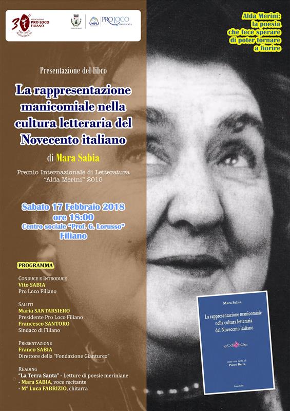Sabato 17 febbraio 2018, alle ore 18, sarà presentato presso la biblioteca comunale di Filiano il libro “La rappresentazione manicomiale nella cultura letteraria del Novecento italiano” della poetessa aviglianese Mara Sabia.