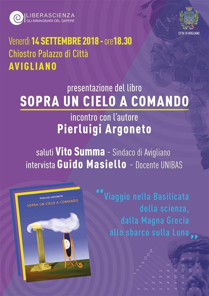 E’ con enorme piacere ed entusiasmo che accogliamo nella nostra Città il progetto editoriale “Sopra un Cielo a Comando” , prodotto da Liberascienza, scritto da Pierluigi Argoneto ed edito da CalicEditori: il libro nasce dall’idea di voler raccontare la Basilicata per rimettere al centro della scena i personaggi e i luoghi protagonisti di idee, leggi, teoremi e conoscenze che hanno consentito lo sviluppo della cultura scientifica mondiale. Muovendosi a partire dai luoghi della nostra regione, le storie narrate si snodano dall'Europa del Nord all'estremo Oriente, dalla Magna Grecia alla Luna, dai filosofi agli artisti, dai matematici ai musicisti, trovando nella geografia lucana il loro punto focale, il punto dal quale si è partiti e al quale si ritorna. La presentazione è un'opportunità per contribuire alla realizzazione del Festival della Divulgazione, l'appuntamento annuale di Liberascienza per approfondire e riflettere sul mondo che ci circonda. Domenica 16 la presentazione sarà accompagnata dalle note di Raffaele Maio, giovane musicista del nostro Comune. Tutta la cittadinanza è invitata a partecipare. |