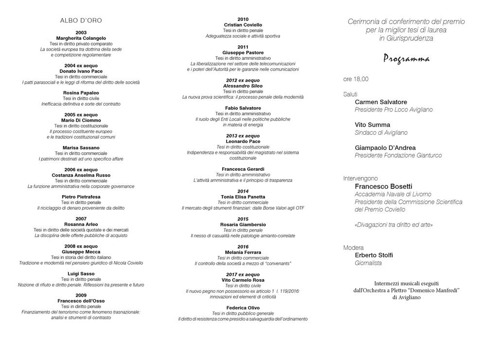 La Pro Loco di Avigliano-dichiara la presidente Carmen Salvatore- con orgoglio rivendica l’istituzione del premio giuridico altro fiore all’occhiello del suo programma annuale. Si tratta di una manifestazione molto sentita dalla comunità e dalle istituzioni locali oltre che dall’intero mondo associativo aviglianese. Ringrazio l’Amministrazione comunale e gli uffici per il continuo supporto e la donazione delle pubblicazioni per i vincitori, la Fondazione Gianturco, la Società Operaia di Mutuo Soccorso e l’orchestra a plettro “D.Manfredi” di Avigliano che per il secondo anno consecutivo arricchirà il programma serale. Infine un ringraziamento particolare ai membri della Commissione Scientifica del Premio: Francesco Antonio Genovese, Francesco Bosetti, Claudio Tedeschi, Ferdinando Treggiari, Antonello Cimadomo ed Aldo Morlino che con grande slancio e generosità consentono a questo premio di continuare ad esistere ed a crescere. Senza la loro abnegazione tutto questo non sarebbe possibile.