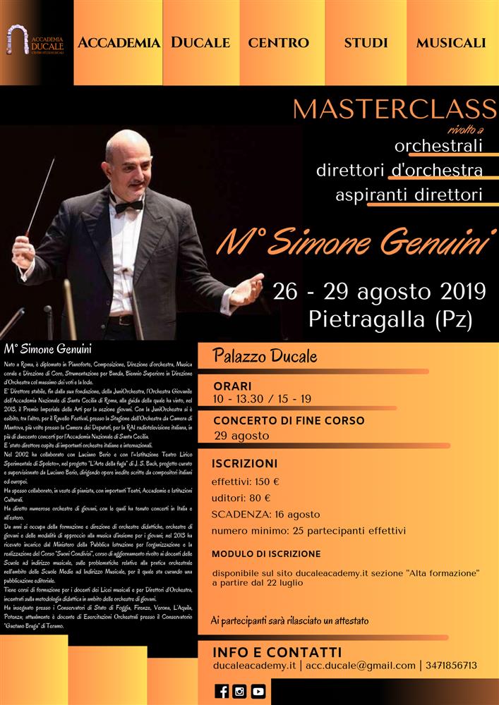 “MASTERCLASS M.SIMONE GENUINI” PER ORCHESTRALI, DIRETTORI D’ORCHESTRA, ASPIRANTI DIRETTORI PIETRAGALLA 26-29 AGOSTO 2019 ACCADEMIA DUCALE CENTRO STUDI MUSICALI |