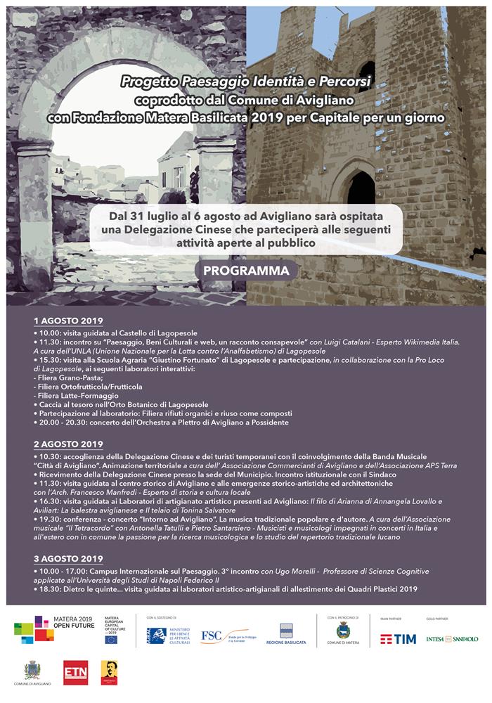 | Dal 31 luglio al 6 agosto ad Avigliano si svolgeranno, nell’ambito del Progetto Paesaggi Identità e Percorsi, coprodotto dal Comune di Avigliano con la Fondazione Matera Basilicata 2019 per Capitale per un giorno, una serie di eventi di animazione territoriale rivolti all’accoglienza di una delegazione cinese in visita nella cittadina gianturchiana ed dei turisti temporanei, che avranno la possibilità di essere protagonisti nel percorso di scoperta dell’identità dei luoghi e del paesaggio.