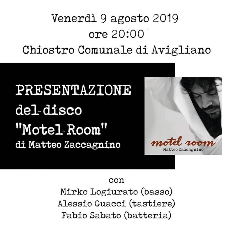 | Il 9 agosto 2019 nella suggestiva cornice del chiostro comunale di Avigliano Matteo Zaccagnino, giovane musicista locale, presenterà il suo primo lavoro da solista dal titolo Motel Room.
