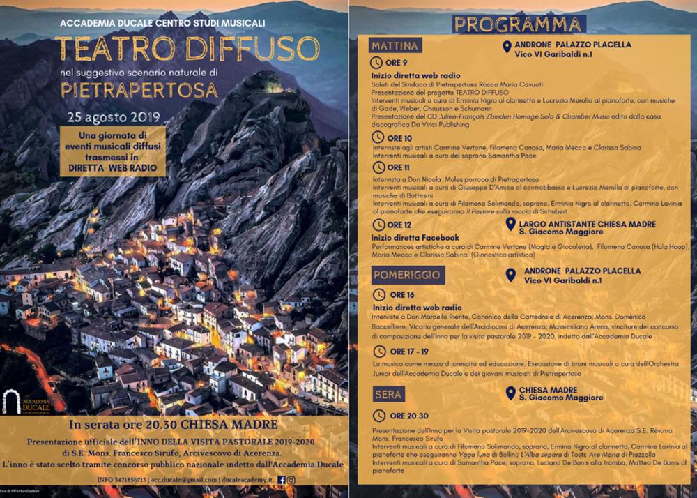 | Domenica 25 agosto a Pietrapertosa si svolgerà l’evento “Teatro diffuso”, un’intera giornata di eventi musicali e artistici diffusi, trasmessi anche in diretta web radio.