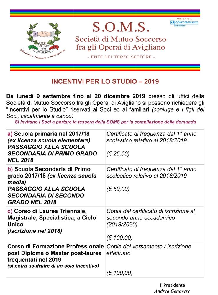 SOCIETA’ DI MUTUO SOCCORSO FRA GLI OPERAI di AVIGLIANO (PZ) si possono richiedere gli “Incentivi per lo Studio” riservati ai Soci ed ai familiari conviventi. |