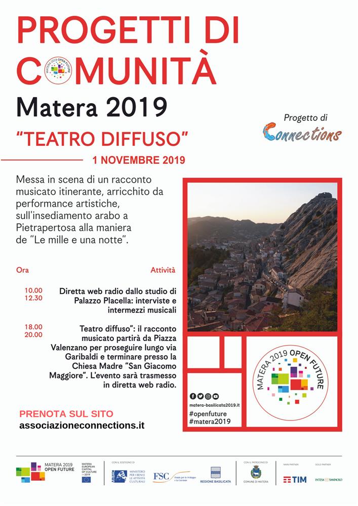 La conformazione di Pietrapertosa ricorda quella di un anfiteatro greco e da qui è partita l’intuizione di farlo diventare un teatro diffuso, un enorme palcoscenico a cielo aperto in cui le case private e gli spazi pubblici diventano luoghi adatti ad ospitare performance musicali, mentre la piazza fa da platea per il pubblico che potrà fruire di uno spettacolo unico. La zona più caratteristica di Pietrapertosa è il rione Arabata, quartiere antico abitato dagli Arabi per quasi 50 anni. Vi si possono vedere ancora le case arroccate sulla roccia, le piccole strade interne e le numerose scalette che si perdono in un intricato labirinto. Da qui lo spunto per il progetto, che consiste nella messa in scena di un racconto musicato che tratterà, tra storia e mito, della genesi dell’insediamento arabo, degli usi e costumi di quel tempo, il tutto presentato alla maniera de “Le mille e una notte”. Per la realizzazione dello spettacolo, la comunità di Pietrapertosa metterà a disposizione balconi, terrazzi, gli androni delle proprie case per ospitare gli artisti e collaborerà all’evento curando l’accoglienza sia dei propri compaesani sia di quanti giungeranno da altri luoghi, attratti da un suggestivo spettacolo en plein air. Il valore aggiunto del progetto sta nella collaborazione delle diverse forze culturali locali. Pietrapertosa ha dato i natali a Francesco Torraca e in suo ricordo è stato costituito un attivo comitato che contribuirà a realizzare la parte narrativa dell’evento, collaborando alla stesura del testo, mentre l’allestimento scenografico sarà curato dagli artisti locali attraverso dei laboratori. La parte musicale verrà, invece, affidata ad associazioni culturali musicali locali. Il risultato sarà un'opera d’arte multidisciplinare creata dall'intera comunità che verrà registrata ed edita. Un esempio tangibile di come lavorare insieme sia il modo migliore per far crescere una comunità e, soprattutto per i più giovani, sarà l’occasione per dare nuovo valore al luogo in cui vivono e alla sua storia che potranno illustrare ai visitatori, accolti nella bellezza. L’evento sarà trasmesso in diretta grazie alla web radio dell’Accademia Ducale centro studi musicali, associazione che proporrà anch’essa un Progetto di comunità. Tra le due associazioni è nata una collaborazione che consentirà ad entrambe di arricchire i rispettivi progetti avvalendosi delle competenze e dei mezzi tecnici che l’una può mettere a disposizione dell’altra. Un reciproco scambio che rientra nello spirito dei progetti di comunità. Per registrarsi all'evento visitare il sito associazioneconnections.it o utilizzare il seguente link: https://www.eventbrite.it/e/biglietti-teatro-diffuso-74559929757 Per seguire l'evento sulla web radio utilizzare il seguente link: |