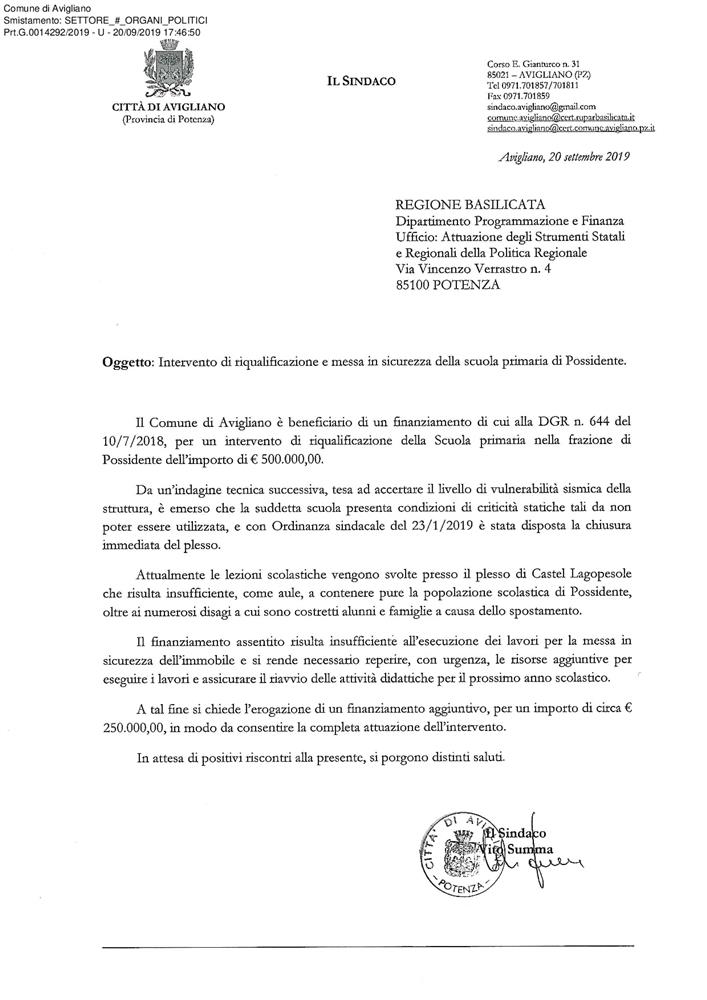 | Si esprimere un sentito ringraziamento alla Giunta Regionale e al Presidente Bardi per aver accolto la richiesta di un finanziamento aggiuntivo euro 250.000 che consentirà la esecuzione dei i lavori di messa in sicurezza del plesso scolastico di Possidente e la elaborazione di una proposta progettuale che possa prevedere la demolizione e ricostruzione in tempi rapidi della struttura.