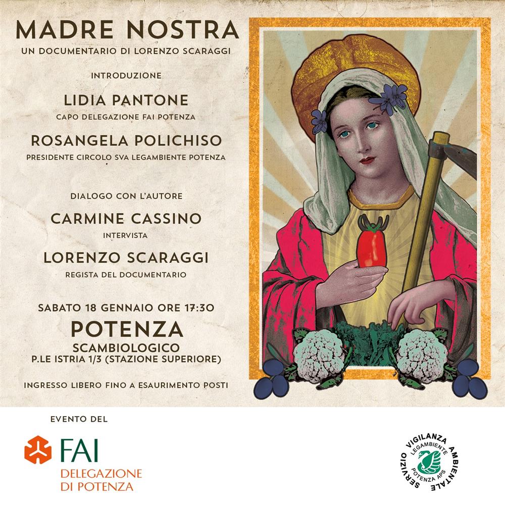 | Il 18 gennaio alle ore 17:30 verrà proiettato il documentario di Lorenzo Scaraggi “Madre Nostra”, a cura del FAI Delegazione di Potenza e del Circolo SVA Legambiente Potenza, presso la sede di ScamBioLoGiCo, Piazzale Istria 1/3 (Stazione Superiore-Santa Maria), a Potenza. “Madre Nostra”, già premiato con un secondo posto all’Italian Film Festival di Cardiff e in concorso in numerosi altri festival italiani e internazionali, è un reportage “on the road” che parte dalla terra, redentrice e punto di partenza per una nuova esistenza per donne e uomini. “Una smisurata preghiera, un modo per riconoscere che se Padre Nostro è nei cieli, Madre Nostra è in terra”, questa è l’autodefinizione che Lorenzo Scaraggi, regista bitontino, dà del suo ultimo lavoro, documentario sul potere della terra di redimere luoghi e persone, prodotto da Fondazione con il Sud e Apulia Film Commission, attraverso il Social film fund Con il Sud.