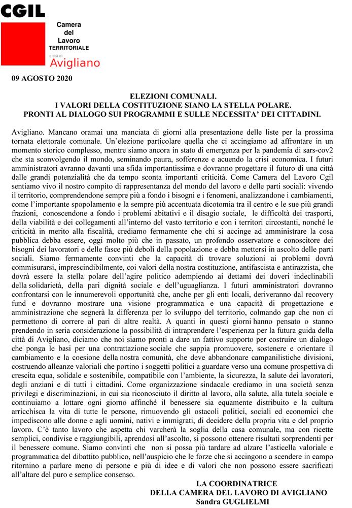 da LA COORDINATRICE DELLA CAMERA DEL LAVORO DI AVIGLIANO Sandra GUGLIELMI |