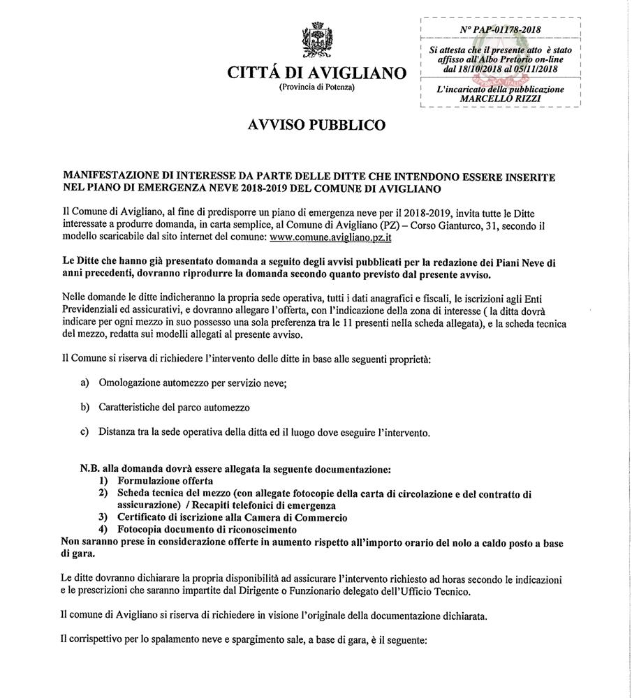 Come vedete: ci sono sempre stati, ed approvati per tempo. Sarebbe solamente bastato cercarli sul sito del Comune di Avigliano. Basta una semplice occhiata per notare le differenze con il prontuario alla cittadinanza presentato ieri dal sindaco Giuseppe Mecca e spacciato come "Piano Neve 2020/21". In un vero Piano Neve, degno di essere chiamato come tale, nulla è improvvisato. È tutto strutturato, dettagliato, programmato: sono articolati gli interventi da effettuare, menzionate le cifre stanziate per portarli a termine, elencati materiali da acquistare, la manodopera da utilizzare e persino il parco automezzi da impiegare. Ci costa sottolineare, purtroppo, come nulla di tutto ciò sia presente nel sedicente "Piano Neve 2020/2021", in realtà un semplice vademecum per i cittadini. Per giunta copiato da un'altra realtà e trapiantato nella nostra. Si, copiato e non preso a modello. Perché c'é una differenza sostanziale tra le due cose: prendere spunto significa trarre ispirazione e quindi presuppone una conseguente fase di ricerca, rielaborazione e rimodulazione sulle peculiarità di un determinato territorio. Un'operazione palesemente saltata a piè pari da questa giunta, tradita forse dall'impazienza di mostrarsi efficiente. Dovrebbe essere ovvio: non esiste un modello valido per ogni luogo, semplicemente perché non esistono luoghi uguali, con uguali caratteristiche e specificità. Qualcosa che dovrebbe conoscere molto bene il sindaco, che ha detto di assumersi ogni responsabilità, ma non senza prima lasciare intendere come l'individuazione di un Piano Neve fosse stata affidata all'Ufficio Tecnico, avventurandosi in un infantile e subdolo gioco dello scaricabarile. Del resto, solo ieri, egli stesso si gloriava insieme all'Assessore preposto della presentazione del Piano Neve. Oggi, invece, scopriamo che in realtà il Piano Neve è stato "redatto" dagli uffici comunali. Come si suol dire: i meriti sono i miei, ma le colpe degli altri. |
