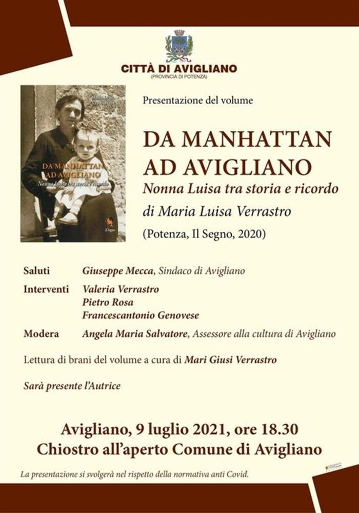 | Il 9 luglio alle 18.30 ad Avigliano nel chiostro all’aperto della sede comunale sarà presentato il volume di Maria Luisa Verrastro dal titolo “Da Manhattan ad Avigliano. Nonna Luisa tra storia e ricordo” Il Segno editore.