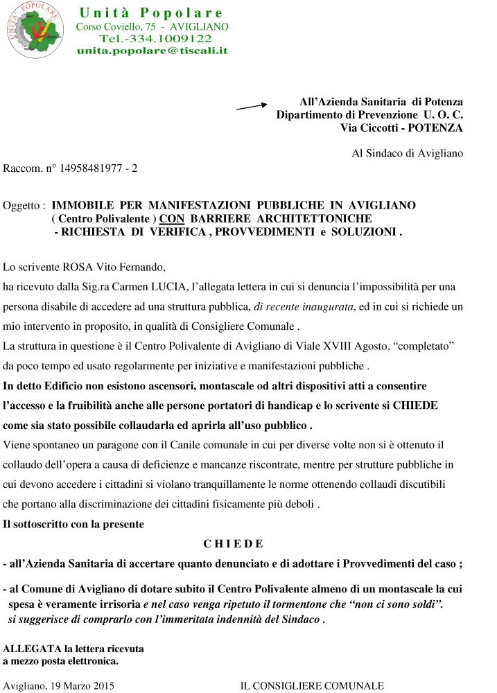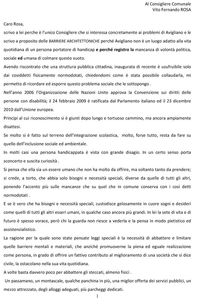 scrivo a lei perche è l’unico Consigliere che si interessa concretamente ai problemi di Avigliano e le scrivo a proposito delle BARRIERE ARCHITETTONICHE perché Avigliano non è un luogo adatto alla vita quotidiana di un persona portatore di handicap e perché registro la mancanza di volontà politica, sociale ed umana di colmare questo vuoto.
