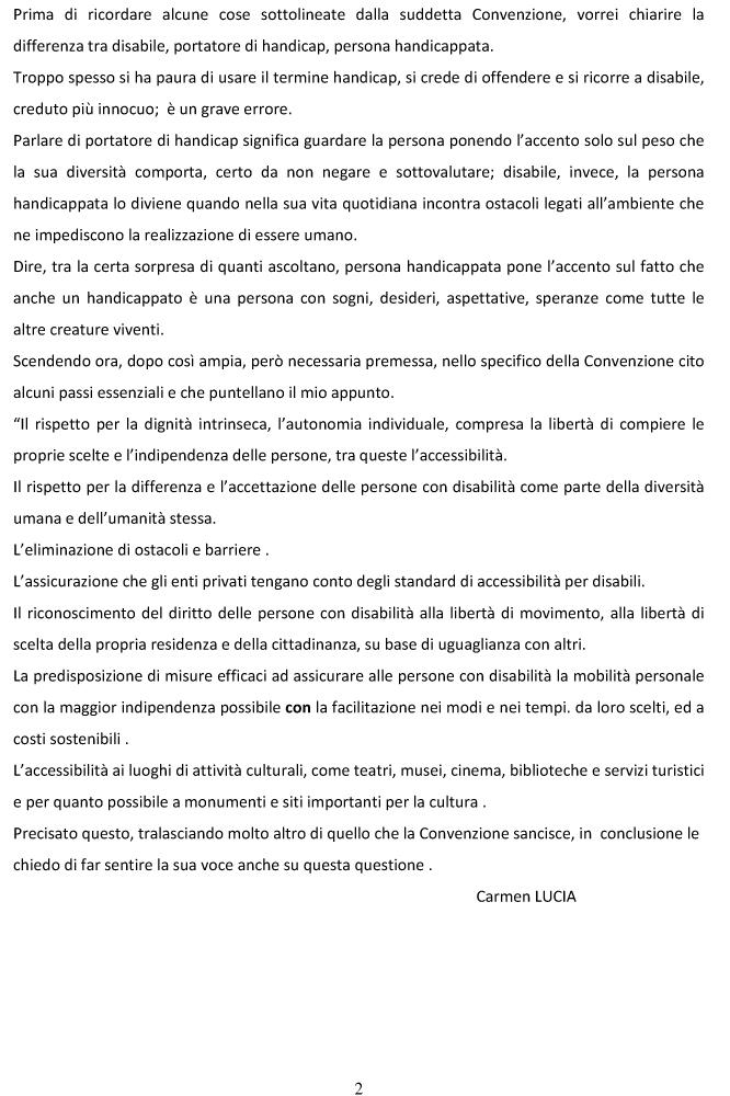 Avendo riscontrato che una struttura pubblica cittadina, inaugurata di recente è usufruibile solo dai cosiddetti fisicamente normodotati, chiedendomi come è stata possibile collaudarla, mi permetto di ricordare ed esporre questo problema sociale che le sottopongo .