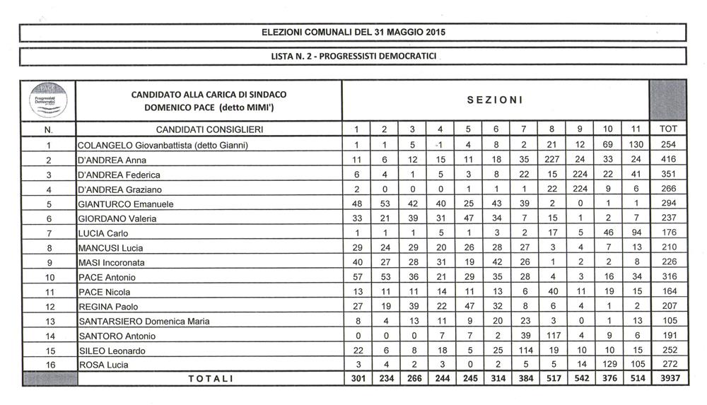 · Mimì Pace (Progressisti Democratici) · Anna D'Andrea (Progressisti Democratici) · Federica D'Andrea (Progressisti Democratici) · Antonio Pace (Progressisti Democratici) · Vito Lorusso (Avigliano Libera)