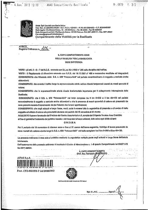 | Ordinanza ANAS COMPARTIMENTO BASILICATA fonte: ALBO PRETORIO COMUNE DI AVIGLIANO N° 1057 |
