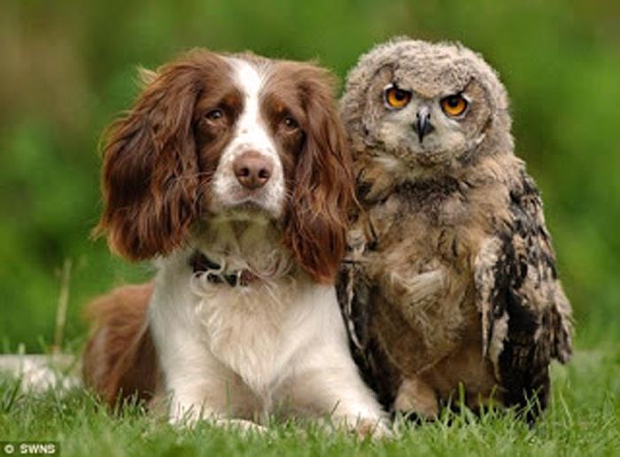 | Un'orfanella di gufo reale è stata adottata da una springer spaniel. Il pulcino femmina, che si chiama Bramble, è stata accolta al Centro di soccorso per rapaci di Liskeard, in Cornovaglia, dove ha trovato una nuova mamma in Sophie, la cagnolina della struttura. La coppia è divantata inseparabile e Sophie pulisce tutti i giorni Bramble leccandola. La piccola apprezza talmente le attenzioni della spaniel che la va a cercare tutti i giorni e le vola intorno, richiedendo la sua tolettatura quotidiana. Sharon Bindon, la direttrice del centro, ha dichiarato: "Quando Bramble è arrivata non aveva piume e abbiamo dovuto tenerla all'interno del centro. Sophie ha cominciato a prendersi cura di lei fin dal primo giorno, pulendola mentre stavano sedute sul divano. E la pulizia di Bramble è diventato un rito quotidiano. La piccola veniva messa fuori dalla gabbia in modo che Sophie potesse leccarla. Ha il becco e le piume più pulite di tutti gli uccelli della contea!" ( The Sun)