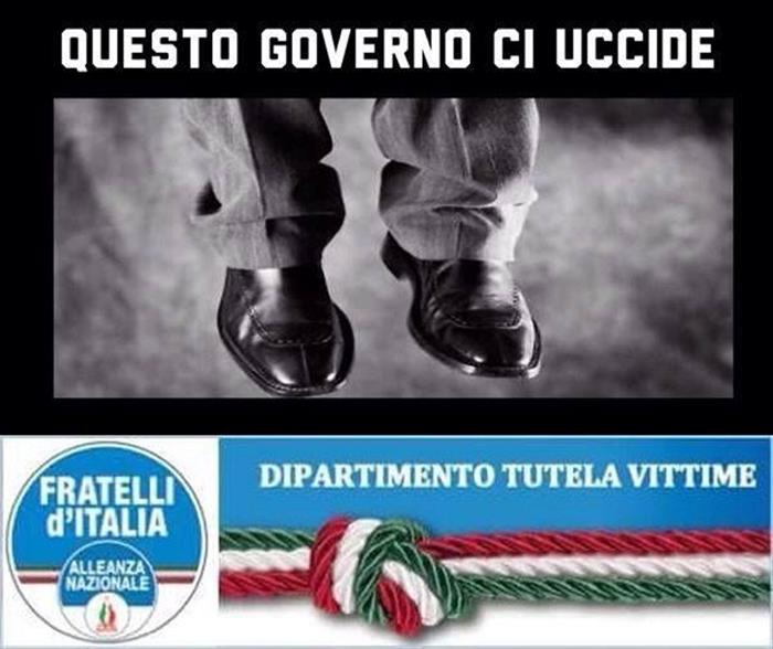 | Il suicidio del pensionato di Civitavecchia costringe tutti noi ad un riflessione profonda rispetto al presunto salvataggio delle banche sbandierato da Renzi. Alla Banca d'Italia spetta infatti il compito di vigilare sugli istituti di credito, a evitare gestioni scorrette e a tutelare i risparmiatoti, a maggior ragione per Banca Etruria, Banca Marche, Cassa risparmio Ferrara e Cassa risparmio Chieti, commissariate proprio da Bankitalia due anni fa. Il risultato è che migliaia di famiglie sono finite sul lastrico ma non solo a causa di questo scellerato provvedimento E' in atto la morte dello stato sociale,sempre più famiglie e persone hanno perso ogni tipo di tutela e lo stato da loro alleato ideale è diventato il più severo degli aguzzini. Il dipartimento tutela vittime di Basilicata , nel ricordare tutte le persone che non sono riuscite ad andare avanti perchè calpestate nella propria dignità a causa di un governo cieco sempre più amico di banche e lobby di potere lancia oggi una campagna social di denucia denominata " Questo governo ci uccide" .Il fine è quello di scuotere la coscienza civile su un problema molto spesso sottovalutato ma purtroppo sempre più dilagante. Le persone chiedono maggiori tutele e lo stato non può non ascoltarle .Riprendiamoci la nostra dignità. #questogovernociuccide |
