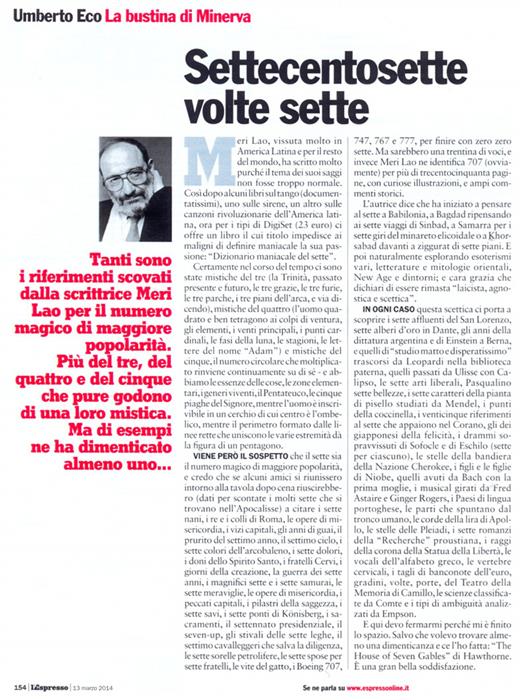 | Un cognome sintetico, evocativo, "Eco", per una delle figure, fra le più grandi, affacciatesi dal '900 sulla soglia del 3^ millennio. Semiologo, filosofo, giornalista (La bustina di minerva sull'Espresso), scrittore prolifico fra i più arguti e raffinati. Autore, fra l'altro, del libro italiano più venduto nel mondo "Il nome della rosa", presente in tutte le biblioteche private d'Italia, fatta salva qualche rara eccezione e dal quale libro è stato tratto uno dei più bei film di sempre, che senza tema di smentita è da considerarsi un capolavoro assoluto. Un "giallo storico" ambientato nel passato, con sullo sfondo la Santa Inquisizione, che ha tenuto col fiato sospeso lettori e spettatori e col quale il genio di Eco, narrando gli "anni bui" del Medioevo è riuscito ad illuminare i giorni nostri che in quanto ad oscurantismo culturale non hanno nulla da invidiare ai secoli andati. Grazie Umberto per l'eredità che lasci, da ieri il tuo sorriso non è più fra noi, ma ci consola la consapevolezza che il tuo cammino attraverso il futuro non finirà mai! |