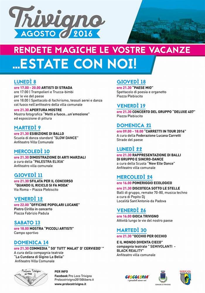 | Tradizione, arte, cultura, creatività, musica, spettacolo, gusto, sapori, teatro, ballo, sport, divertimento e socializzazione, sono solo alcune delle parole chiave del cartellone di Trivigno “…Estate con noi” dal prossimo 8 agosto con conclusione il 30.