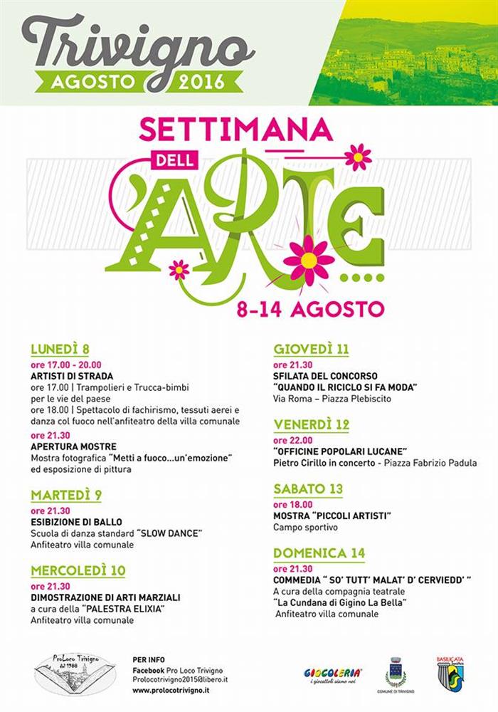 L’organizzazione è curata dalla Pro Loco, con il patrocinio del Comune di Trivigno e dell’APT Basilicata, grazie anche al supporto di “Giocoleria”. La settimana dell’Arte (8-14 agosto) partirà con l’inaugurazione di alcune mostre pittoriche e la rassegna fotografica “Metti a fuoco… un’emozione” relativa alla festa di Sant’Antonio Abate. Trampolieri, fachiri e artisti di strada divertiranno grandi e piccoli. Non mancheranno esibizioni di ballo a cura della Scuola “Slow Dance” e di Arti Marziali a cura della “Palestra Elixia”. Giovedì 11, in Via Roma- Piazza Plebiscito, sfileranno gli abiti del concorso “Quando il riciclo si fa moda”, mentre il giorno seguente Pietro Cirillo e le “Officine Popolari Lucane” si esibiranno in concerto in Piazza Padula. Sabato 13 nel campo sportivo la mostra “Piccoli artisti”, mentre domenica, nell’Anfiteatro comunale è la volta del teatro con la compagnia “La Cundana di Gigino Labella” con la commedia “So tutt’ malat’ d’ cerviedd’”. Le iniziative contenute nel cartellone estivo sono in continuità con le proposte che già da mesi la Pro Loco offre alla comunità locale e ai comuni limitrofi, anche in virtù della nascita dell’Unione dei Comuni e delle Pro Loco Val Camastra Basento, che persegue un progetto con una visione unitaria e strategica che ha come obiettivo un nuovo e maggior sviluppo delle risorse dell’area della circoscrizione, pur mantenendo vive le radici delle antiche tradizioni. Il Presidente della Proloco di Trivigno