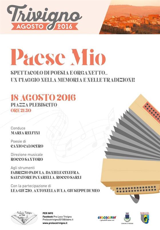 Oggi sarà la volta di “Paese mio”, spettacolo di poesia e organetto: viaggio nella memoria e nelle tradizioni della Lucania, la sua gente, il territorio, l'emigrazione e il brigantaggio. Musica popolare e non solo: la tradizione musicale locale si alternerà con quella dei cantautori italiani più conosciuti. Le poesie di Canio Calocero, medico e appassionato di varie forme di espressione, si uniranno alle nostalgiche note - organetto e tastiere - di Fabrizio Padula, Daniele Cinefra, Rocco Sarli e Salvatore Passarella. I giovani sono seguiti e diretti dal maestro Rocco Santoro, autore anche di alcune suonate con l'organetto diatonico. Un video realizzato da Carlo Andriuoli completerà il triangolo di immagini, musica e poesia. La serata sarà condotta da Maria Relvini e prevede la partecipazione di Lea Giuzio, Antonella Iula e Giuseppe di Meo.