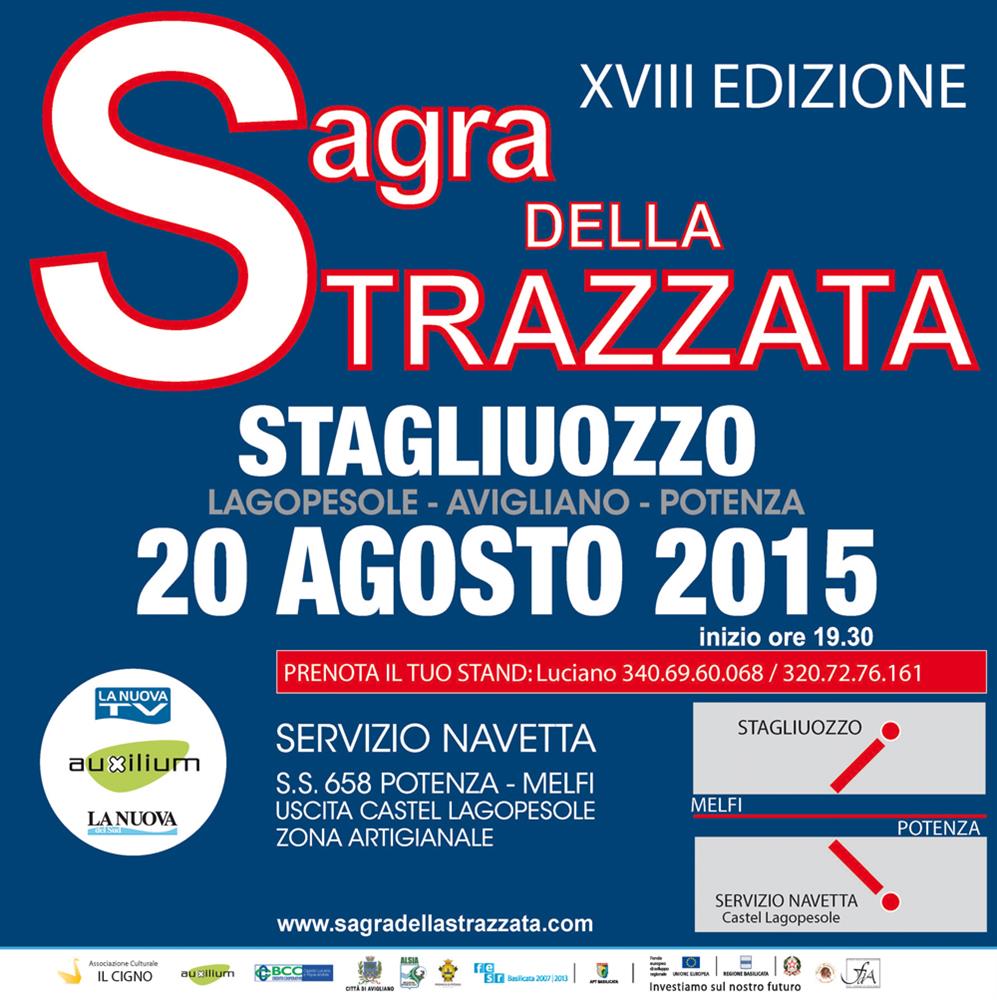 | a Stagliuozzo - Avigliano (PZ) L'associazione culturale "IL Cigno" - comitato "Sagra della Strazzata" organizzano la XIX° edizione della "SAGRA DELLA STRAZZATA" nella Frazione di Stagliuozzo a 3 km da Lagopesole - Avigliano. Programma: ore 19:30 Apertura stand con degustazione della Strazzata e altri prodotti tipici "Lucani"; ore 20:30 "Conturban" street band per le vie della Frazione; ore 21:30 Liscio in piazza con il gruppo musicale "I Ballabili"; ore 24:00 Discomusic con "Dj Denny". Per raggiungerci: Strada statale 658 Potenza- Melfi, uscita Lagopesole e segiure indicazioni "SAGRA DELLA STRAZZATA". Navetta disponibile dalla zone paip di Castel Lagopesole. |