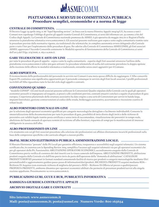 Tra di essi, la Centrale di Committenza ASMEL Consortile (ASMECOMM), attivata dallo scorso Aprile 2013, nel rispetto di quanto prescritto dall’art. 33 comma 3-bis del Codice, recentemente novellato dal DL 66/2014 “attraverso apposito accordo consortile tra i Comuni medesimi ed avvalendosi dei competenti Uffici”, che permette di garantire una centralizzazione “su misura” come richiesto dagli Enti