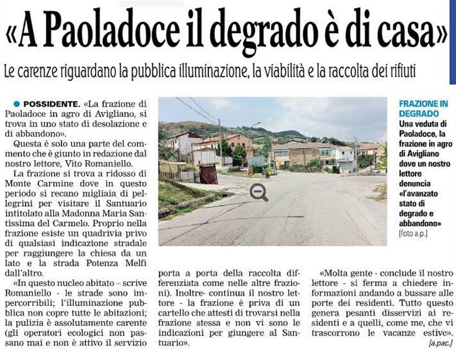 POSSIDENTE. La frazione di Paoladoce in agro di Avigliano, si trova in uno stato di desolazione e di abbandono. Questa è solo una parte del commento che è giunto in redazione da nostro lettore, Vito Romaniello. La frazione si trova a ridosso di Monte Carmine dove in questo periodo si recano migliaia di pellegrini per visitare il Santuario intitolato alla Madonna Maria Santissima del Carmelo. Proprio nella frazione esiste un quadrivia privo di qualsiasi indicazione stradale per raggiungere la chiesa da un lato e la strada Potenza Melfi dall'altro. In questo nucleo abitato - scrive Romaniello - le strade sono impercorribili; l'illuminazione pubblica non copre tutte le abitazioni; la pulizia è assolutamente carente (gli operatori ecologici non passano mai è non è attivo il servizio porta a porta della raccolta differenziata come nella altre frazioni). Inoltre - continua il nostro lettore - la frazione è priva di un cartello che attesti di trovarsi nella frazione stessa e non vi sono le indicazioni per giungere al Santuario; Molta gente - conclude il nostro lettore - si ferma a chiedere informazioni andando a bussare alle porte dei residenti. Tutto questo genera pesanti disservizi ai residenti e a quelli, come me, che vi trascorrono le vacande estive.