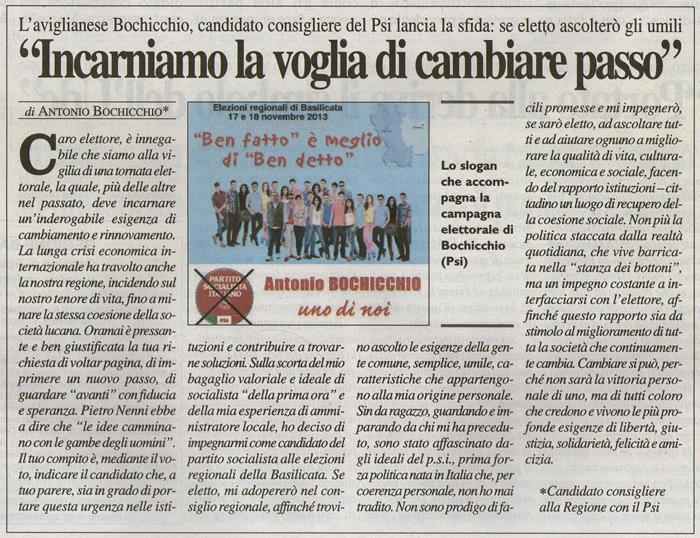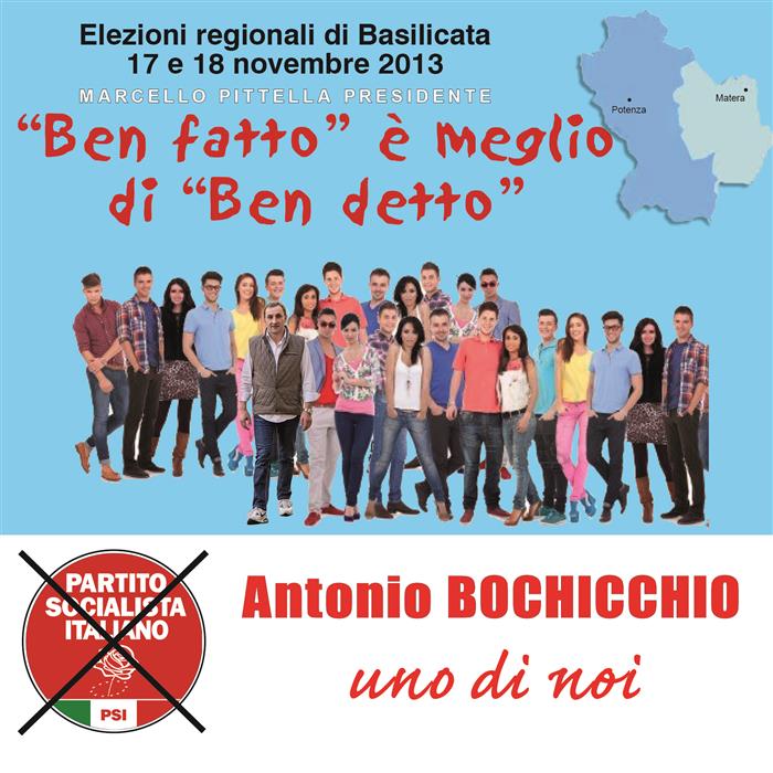 Caro elettore, è innegabile che siamo alla vigilia di una tornata elettorale, la quale, più delle altre nel passato, deve incarnare un’inderogabile esigenza di cambiamento e rinnovamento. la lunga crisi economica internazionale ha travolto anche la nostra regione, incidendo sul nostro tenore di vita, fino a minare la stessa coesione della società lucana. oramai è pressante e ben giustificata la tua richiesta di voltar pagina, di imprimere un nuovo passo, di guardare “avanti” con fiducia e speranza. Pietro Nenni ebbe a dire che “le idee camminano con le gambe degli uomini”. il tuo compito è, mediante il voto, indicare il candidato che, a tuo parere, sia in grado di portare questa urgenza nelle istituzioni e contribuire a trovarne soluzioni. sulla scorta del mio bagaglio valoriale e ideale di socialista “della prima ora” e della mia esperienza di amministratore locale, ho deciso di impegnarmi come candidato del partito socialista alle elezioni regionali della Basilicata. se eletto, mi adopererò nel consiglio regionale, affinché trovino ascolto le esigenze della gente comune, semplice, umile, caratteristiche che appartengono alla mia origine personale. Sin da ragazzo, guardando e imparando da chi mi ha preceduto, sono stato affascinato dagli ideali del p.s.i., prima forza politica nata in Italia che, per coerenza personale, non ho mai tradito. non sono prodigo di facili promesse e mi impegnerò, se sarò eletto, ad ascoltare tutti e ad aiutare ognuno a migliorare la qualità di vita, culturale, economica e sociale, facendo del rapporto istituzioni – cittadino un luogo di recupero della coesione sociale. non più la politica staccata dalla realtà quotidiana, che vive barricata nella “stanza dei bottoni”, ma un impegno costante a interfacciarsi con l’elettore, affinché questo rapporto sia da stimolo al miglioramento di tutta la società che continuamente cambia. Cambiare si può, perché non sarà la vittoria personale di uno, ma di tutti coloro che credono e vivono le più profonde esigenze di libertà, giustizia, solidarietà, felicità e amicizia.