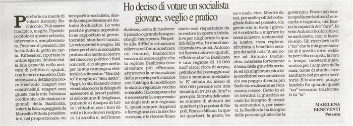 Perché ho in mente di votare Antonio Bochicchio. Può essere l’incipit o, meglio, l’ipotetico titolo di questo articolo, intervento o, semplicemente, l’insieme di pensieri, che ho buttato di getto su carta. Riflessioni riportate in ordine sparso, limitato dalla mia capacità nello scrivere di politica e, quindi, non in modo esaustivo. Considerazioni, dettate tra cuore e cervello, magari non condivisibili, magari non giuste, ma le mie. Iniziamo col dire che, alle elezioni regionali della Basilicata, voterò la lista capeggiata da Marcello Pittella presidente e, nel proporzionale, voterò partito socialista, dando la mia preferenza ad Antonio Bochicchio. Lo voto perché è giovane, soprattutto se rapportato ai gerontocratici standard lucani. Lo voto perché è sveglio. Mi piace perché è un socialista pratico che mette al centro del discorso politico i fatti concreti, e lo slogan scelto per la sua campagna elettorale lo dimostra: “Ben fatto” è meglio di “Ben detto”. Oggi, lo sta facendo come vicesindaco con la delega di assessore ai lavori pubblici del comune di Avigliano, ponendo al disopra di tutto i cittadini con i loro diritti e i loro doveri reciproci. Li ascolta e, nell’immediatezza, cerca di risolvere il piccolo o grande bisogno che gli viene posto. Rispetto alla difficile situazione odierna nell’amministrare un comune, Bochicchio mostra di avere capito che la regione Basilicata deve diventare più efficiente, attraverso la misurazione della propria performance con l’obbligo di modificare lo statuto regionale vecchio e obsoleto. Ha compreso che è necessaria la soppressione degli enti sub regionali, quasi sempre doppioni e farraginosi con la loro burocrazia, e le risorse finanziarie così risparmiate da investire in opere o iniziative per migliorare la qualità della vita. In una chiacchierata tra amici, Antonio mi faceva notare e, quindi, riflettere che “la Basilicata è una regione di 10.000 km² circa: ricca di acqua, petrolio e dal paesaggio marino e montano invidiabile. E’ abitata da meno di 600.000 persone con una densità di 57,00 ab./km² o poco più. Si tratta dello stesso numero di abitanti dei quartieri più popolosi di Napoli, Roma o Milano. In questi quartieri, la gente, bene o male, vive. Mentre da noi, per scelte politiche sbagliate fatte nel passato, e la gente con in testa i giovani è costretta a migrare in cerca di lavoro, lontano dalla nostra ricca regione, sfruttata a beneficio sempre dei soliti noti.”A me, come ad Antonio Bochicchio, interessa fortemente il tema della giustizia sociale, ed un miglioramento delle condizioni economiche di chi sta peggio diventa più facile da realizzarsi se l’economia cresce. Detto in altri termini: la giustizia sociale ha bisogno di crescita economica e, per esserci, la Basilicata ha bisogno delle persone giuste che la governino. Forse non hanno quella parlantina che incanta e inganna, ma hanno la capacità del “fare”. Io voto Antonio Bochicchio e, se sarà eletto, non lo lascerò solo. Gli ricorderò tutti i “no” che la mia generazione si è sentita dire: reddito per i disoccupati, lavoro a tempo indeterminato, mutuo per l’acquisto della casa, borse di studio, cure sanitarie nel proprio territorio. E lo aiuterò, pungolandolo fin quando questi “no” verranno trasformati in “si”. |