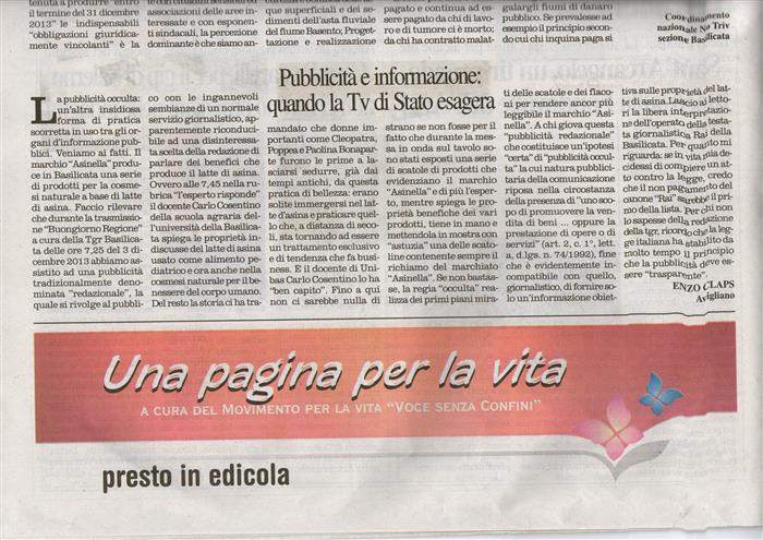 La pubblicità occulta: un’altra insidiosa forma di pratica scorretta in uso tra gli organi d’informazione pubblici. Veniamo ai fatti. Il marchio “Asinella” produce in Basilicata una serie di prodotti per la cosmesi naturale a base di latte di asina. Faccio rilevare che durante la trasmissione “Buongiorno Regione” a cura della Tgr Basilicata delle ore 7,25 del 3 dicembre 2013 abbiamo assistito ad una pubblicità tradizionalmente denominata "redazionale", la quale si rivolge al pubblico con le ingannevoli sembianze di un normale servizio giornalistico, apparentemente riconducibile ad una disinteressata scelta della redazione di parlare dei benefici che produce il latte di asina. Ovvero alle 7,45 nella rubrica “l’esperto risponde” il docente Carlo Cosentino della scuola agraria dell’università della Basilicata spiega le proprietà indiscusse del latte di asina usato come alimento pediatrico e ora anche nella cosmesi naturale per il benessere del corpo umano. Del resto la storia ci ha tramandato che donne importanti come Cleopatra, Poppea e Paolina Bonaparte furono le prime a lasciarsi sedurre, già dai tempi antichi, da questa pratica di bellezza: erano solite immergersi nel latte d’asina e praticare quello che, a distanza di secoli, sta tornando ad essere un trattamento esclusivo e di tendenza che fa business. E il docente di UNIBAS Carlo Cosentino lo ha “ben capito”. Fino a qui non ci sarebbe nulla di strano se non fosse per il fatto che durante la messa in onda sul tavolo (guardate la foto) sono stati esposti una serie di scatole di prodotti che evidenziano il marchio “Asinella” e di più l’esperto, mentre spiega le proprietà benefiche dei vari prodotti, tiene in mano e mettendola in mostra con “astuzia” una delle scatoline contenente sempre il richiamo del marchiato “Asinella” (guardate la foto). Se non bastasse, la regia “occulta” realizza dei primi piani mirati delle scatole e dei flaconi per rendere ancor più leggibile il marchio “Asinella” (guardate la foto). A chi giova questa “pubblicità redazionale” che costituisce un'ipotesi “certa” di “pubblicità occulta” la cui natura pubblicitaria della comunicazione riposa nella circostanza della presenza di "uno scopo di promuovere la vendita di beni ... oppure la prestazione di opere o di servizi" (art. 2, c. 1°, lett. a, d.lgs. n. 74/1992), fine che è evidentemente incompatibile con quello, giornalistico, di fornire solo un’informazione obiettiva sulle proprietà del latte di asina. Lascio ai lettori la libera interpretazione dell’operato della testata giornalistica Rai della Basilicata. Per quanto mi riguarda: se in vita mia decidessi di compiere un atto contro la legge, credo che il non pagamento del canone “RAI” sarebbe il primo della lista. Per chi non lo sapesse della redazione della tgr, ricordo che la legge italiana ha stabilito da molto tempo il principio che la pubblicità deve essere “trasparente”. |