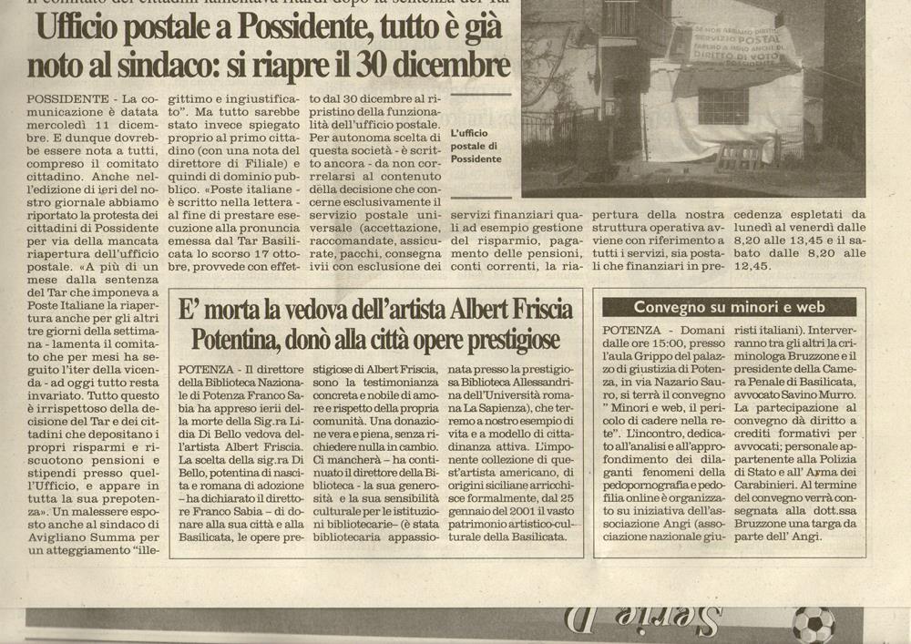 POSSIDENTE - II comitato si affida al sindaco Summa che assicura iniziative legali: comportamento illegittimo e ingiustificato. A più di un mese dalla sentenza del lar che imponeva a Poste Italiane la riapertura dell'Ufficio postale di Possidente di Avigliano anche per gli altri tre giorni della settimana, ad oggi tutto resta invariato. A riferirlo è il comitato cittadino che nei mesi ne ha seguito le vicissitudini. H Tar con quella sentenza ha riconosciuto del tutto infondate le motivazioni portate in sede di giudizio che avevano determinato prima la chiusura totale dell'ufficio postale di Possidente e poi una provvisoria apertura a giorni alterni. "A un mese da tale sentenza il comportamento arrogante di Poste Italiane -attaccano dal comitato è irrispettoso della decisione del lar e dei cittadini che depositano i propri risparmi e riscuotono pensioni e stipendi presso quell'Ufficio, e appare in tutta la sua prepotenza". Perciò il Comitato cittadino ha incontrato il Sindaco di Avigliano, Summa, illustrandogli tale incresciosa situazione. Questi raccogliendo la protesta, ha espresso, oltre che piena solidarietà, il proprio rammarico per il comportamento di Poste Italiane "il legittimo e ingiustificato", impegnandosi a giorni ad "assumere tutte le iniziative per costringerla a rispettare la decisione del Tar". |