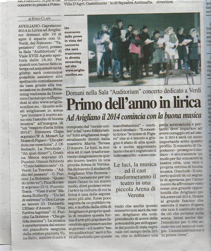 Capodanno 2014 in Lirica ad Avigliano: mercoledì 1 gennaio alle 19,00 si apre il sipario con G. Verdi, dal Nabucco - “Va, pensiero” (Coro), presso la Sala “Auditorium” di Viale XVIII Agosto apertura dalle 18,30. Per quanti non hanno fatto in tempo ad acquistare un biglietto sarà comunque possibile assistere allo spettacolo comodamente da casa grazie alla trasmissione in diretta Streaming realizzata da Domenico Cantalupo collegandosi al sito www.aviglianonline.eu. - Quatto solisti aviglianesi in scena “per iniziare il nuovo anno con l'ascolto di buona musica” all’insegna di “un “respiro d’aria lirica 2014”: Eleonora Claps soprano (W. A. Mozart: Le Nozze di Figaro - “L’ho perduta me meschina”, J. Offenbach: La Perichole - “Ah quel diner!”), Cristina Mecca soprano (G. Puccini: Gianni Schicchi - “O mio babbino caro” - G. Verdi: La Traviata - “Addio del passato” - G. Puccini: La Bohème - “Quando m’en vo”), Pina Sordetti soprano (G G. Puccini: Tosca - “Vissi d’arte” Madama Butterfly - “Un bel dì vedremo”) e Dino Lorusso tenore (G. Donizetti: L'Elisir d'Amore - “Una furtiva lagrima” - G. Puccini: La Bohème - “Che gelida manina”). La musica è caratterizzata dal suono del pianoforte eseguita dalla celebre pianista Yuna Saito, mentre il coro è composto dal “corale unitre” e dal “coro folkloristico” tutti aviglianesi magistralmente diretti dalla maestra Maria Teresa D’Amore. Le luci, la musica ed il cast trasformeranno magicamente questo nuovo teatro in una piccola Arena di Verona. Ha dichiarato il sindaco di Avigliano Vito Summa – “Sarà l'occasione per iniziare l'anno in un nuovo modo, direi proteso verso l’arte e la cultura di cui la lirica è una delle espressioni più alte, forse poco seguita da un pubblico vasto, e la sfida dalla città di Avigliano è proprio quella di rendere questa forma d’arte più popolare facendola apprezzare anche ai giovani – e il nostro “teatro auditorium” sarà il fiore all’occhiello per queste manifestazioni” – continua il sindaco – “Il concerto lirico “le nozze di Figaro” che si è tenuto a giugno è stato di alta qualità e molto apprezzato tanto che si è registrato il tutto esaurito – e sono convinto che anche questo concerto non sarà da meno. Avigliano sta comprendendo di avere delle potenzialità per svilupparsi dal punto di vista regionale nel campo della lirica, che io definisco una perla sconosciuta e pertanto deve imparare ad avere coraggio ed ad osare: il 2014 sarà un anno importante sotto questo profilo. Il concerto di Capodanno – prosegue il sindaco - è sicuramente un modo per far conoscere la nostra città, una vera e propria vetrina di buona musica. Conclude - Il concerto quindi dà un segnale di speranza per l'anno nuovo da affrontare visto come una grande opportunità che Avigliano potrà avere nel 2014. Grazie al grande fascino che esercita il teatro d'opera che non è costituito solo da ciò che avviene sulla scena, bensì anche dall'emozione per il rito sociale che nel teatro si compie. L’amministrazione è in prima linea”. Dopo le parole del sindaco condivisibili, si può dire che ad Avigliano, si va a teatro per vedere ed ascoltare la musica lirica interpretata da protagonisti non professionisti tutti aviglianesi e non certo per farsi vedere, per sfoggiare abiti sontuosi e raffinati gioielli; per intrecciare pettegolezzi, amori; per concludere affari o accordi politici. Comportamenti appartenenti alla cultura della seconda metà dell’ottocento ancora oggi azionata nei teatri frequentati dalla “crème” nazionale lontani dai pensieri comunali di Avigliano. All’”aria” diretta da Pina Sordetti è affidata l’espressione dei sentimenti dei personaggi e la musica prende il sopravvento sull’azione e sul dialogo, ad ogni sillaba corrisponderanno più note (vocalizzi). La voce soprana e quella tenore canteranno con agilità e potenza una melodia ampia e orecchiabile il ritmo sempre regolare e la musica del pianoforte sarà espressiva dell’opera. La voce solista è accompagnata da una base orchestrale. La melodia, attraverso il superamento dell'alternanza di recitativo e aria, assumerà l’andamento del discorso e del dialogo e presenterà un deciso carattere di continuità (la “melodia infinita”); parallelamente accentuata dagli elementi di continuità con l'adozione dei Leitmotive (“motivi conduttori”, temi musicali celebri che caratterizzano un personaggio o un’atmosfera e che ritornano continuamente); il predominio del canto e della voce non è mai assoluto e la musica e il coro diventano protagonisti del dramma, e non come semplice accompagnamento sonoro e vocale. Alla fine Calerà il sipario con G. Verdi: dalla Traviata - “Brindisi”, cantato da tutti pubblico compreso. Il successo è garantito.