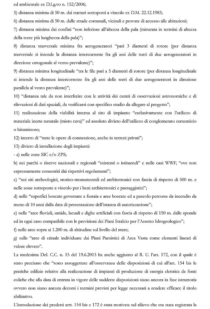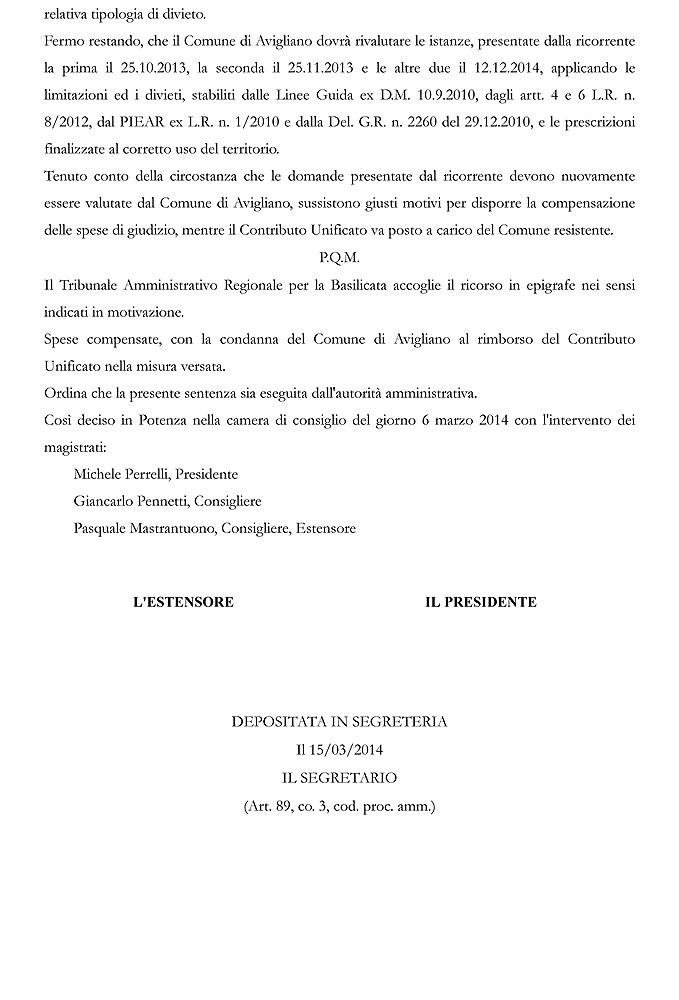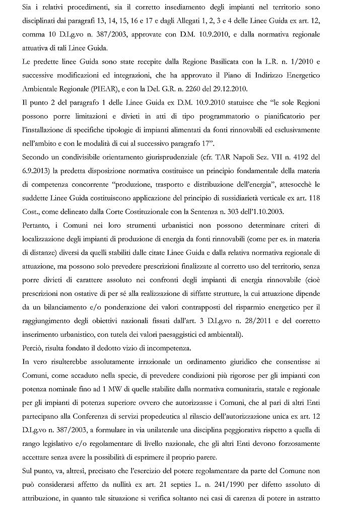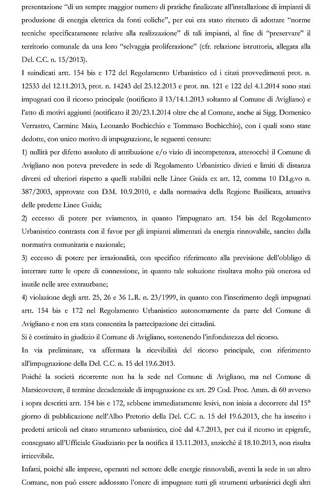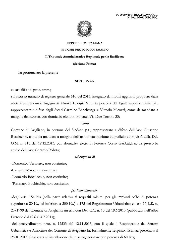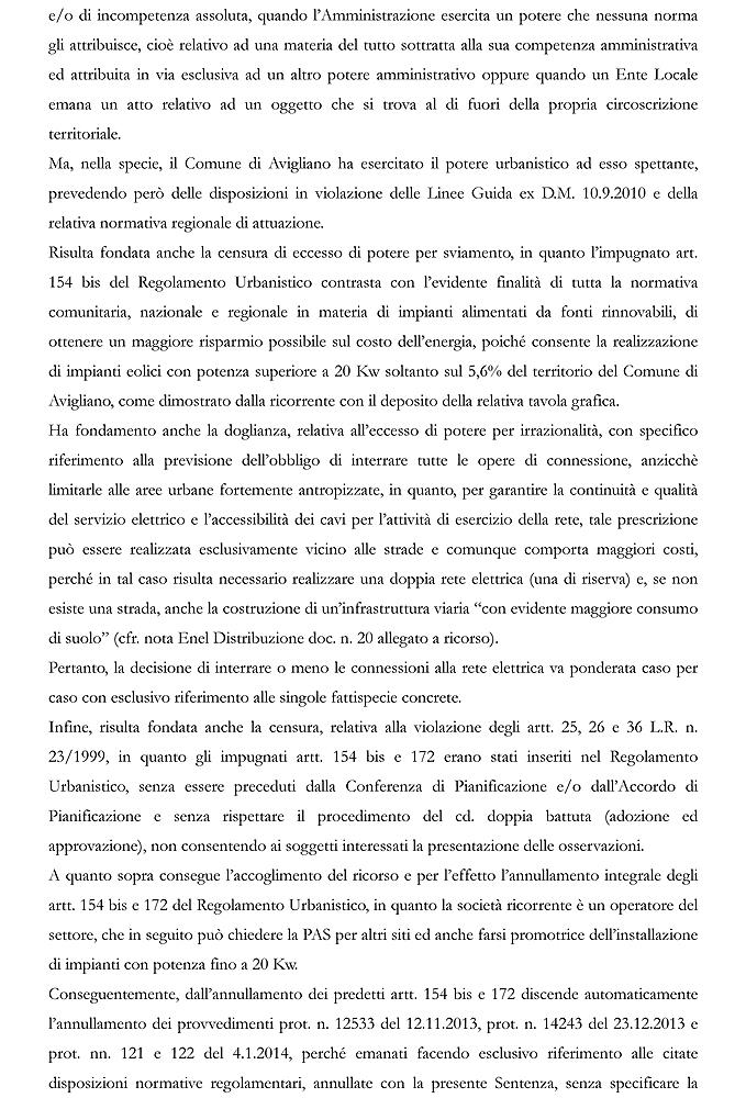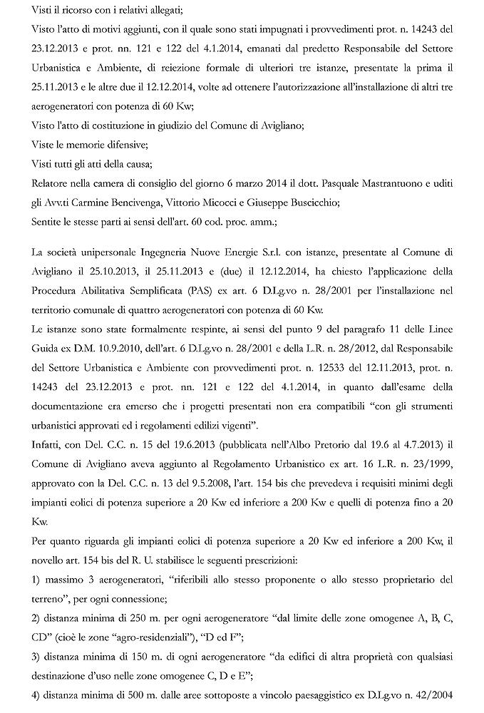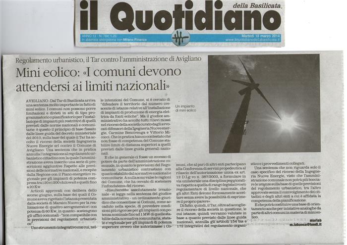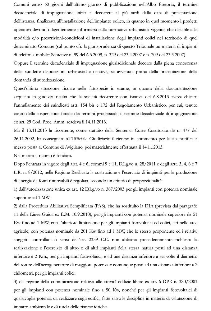Dopo aver letto su Il Quotidiano della Basilicata del 18 marzo l’articolo: “ Regolamento urbanistico, il Tar contro l’amministrazione di Avigliano – Mini eolico: ‘i comuni devono attenersi ai limiti nazionali’”. Sono doverose alcune precisazioni. Partendo da questa affermare: Avigliano, esposto al “conflitto dei venti”: da una parte, la società “Ingegneria Nuove Energie Srl”, ha proposto ricorso al TAR -che ha vinto con la sentenza N. 00610/2013 REG.RIC.- per l’annullamento della deliberazione del Consiglio comunale n. 15 del 19 giugno 2013, nonché di tutti gli atti connessi e consequenziali, con la quale il Comune di Avigliano ha introdotto modifiche al vigente regolamento edilizio comunale in materia di impianti di produzione di energia elettrica da fonte eolica; dall’altra parte, il signor Donato Bochicchio ha notificato tre distinti ricorsi innanzi al TAR, per il silenzio serbato dal Comune di Avigliano, a seguito della presentazione della PAS, ad opera della Società GRD Energia srl, del Sig. Michele De Vivo e della società DR Energia srl (curioso di sapere quale sarà l’esito della sentenza del TAR su questi ultimi ricorsi). Possiamo dire che, ultimamente, per colpa del “vento” non c’è pace per l’Amministrazione comunale: si litiga anche per le pale eoliche e il tribunale amministrativo della Basilicata ci mette del suo. Ho letto la sentenza e mi astengo dal commentarla, ma alcune riflessioni vanno fatte, visto che, con detta sentenza, l’Amministrazione comunale viene tacciata di “eccesso di potere per sviamento”, “eccesso di potere per irrazionalità” e “difetto assoluto di attribuzione e/o vizio di incompetenza”. Il tutto perché non poteva prevedere, in sede di Regolamento Urbanistico, divieti e limiti di distanza diversi ed ulteriori rispetto a quelli stabiliti nelle Linee Guida ex art. 12, comma 10 D.Lg.vo n. 387/2003, approvate con D.M. 10.9.2010, e dalla normativa della Regione Basilicata, attuativa delle predette Linee Guida, eccetera, eccetera. Se l’Amministrazione comunale può essere considerata colpevole di qualcosa, è da ricercare, solamente, nel suo tentativo di difendere il territorio dalle richieste selvagge di installazione di pale mini-eoliche (oltre 90 da aggiungere alle già esistenti) che, guardando le foto, di “mini” hanno ben poco: mulini a vento dalle dimensioni notevoli e dal forte impatto ambientale. Continuando a leggere la sentenza, degna di opportune considerazioni è la parte in cui il giudice relatore afferma: “ (…) Infatti, con Del. C.C. n. 15 del 19.6.2013 (pubblicata nell’Albo Pretorio dal 19.6 al 4.7.2013) il Comune di Avigliano aveva aggiunto al Regolamento Urbanistico ex art. 16 L.R. n. 23/1999, approvato con la Del. C.C. n. 13 del 9.5.2008, l’art. 154 bis che prevedeva i requisiti minimi degli impianti eolici di potenza superiore a 20 Kw ed inferiore a 200 Kw e quelli di potenza fino a 20 Kw. Per quanto riguarda gli impianti eolici di potenza superiore a 20 Kw ed inferiore a 200 Kw, il novello art. 154 bis del R. U. stabilisce le seguenti prescrizioni (…)”. Orbene, scriverebbe un giurista, giova ricordare all’”infatti” relatore che il comune di Avigliano non ha mai approvato il Regolamento Urbanistico - ai sensi dell’ex art. 16 L.R. n. 23/1999 come si legge nella sentenza- ma sta esercitando, nelle more, con il vecchio Piano Regolatore Generale, in quanto il redigente RU giace in contemplazione sul tecnigrafo del luminare progettista, prof. Ing. Carlo Manera. Giova ancora ricordare che, con la Delibera di C.C. n. 13 del 9.5.2008 citata nella sentenza, il Consiglio comunale, giammai, ha approvato il R.U., ma ha solamente integrato il vigente Regolamento Edilizio Comunale, modificando sia l’art. 10 con l’introduzione, dopo il comma 22, il comma 23 riguardante le “Pertinenze” e, dopo l’artico 154, ha inserito l’Allegato “A” riguardante piccole serre, gazebo, pergolati, cassette per ricovero attrezzi da giardino, pensiline a sbalzo, tettoie e portici e tettoie per ricovero autovetture. Da qualche tempo a questa parte, spesso, gli addetti ai lavori confondono il R.U. con il R.E. e si dimenticano volutamente dei Piani Operativi Comunali (POC), forma di regole concentriche, legate tra loro, per una giusta e programmata pianificazione del proprio territorio comunale. Per evitare i “pascoli abusivi”, da parte di pale, palette eoliche e pannelli solari, su tutto il territorio comunale, sarebbe il caso – una buona volta- di “cacciare” il progettista dormiente del Regolamento Urbanistico, e dare mandato, a chi ne capisce, per la redazione di una nuova programmazione urbanistica, inattaccabile per sviamento da ogni forzatura più o meno legale .