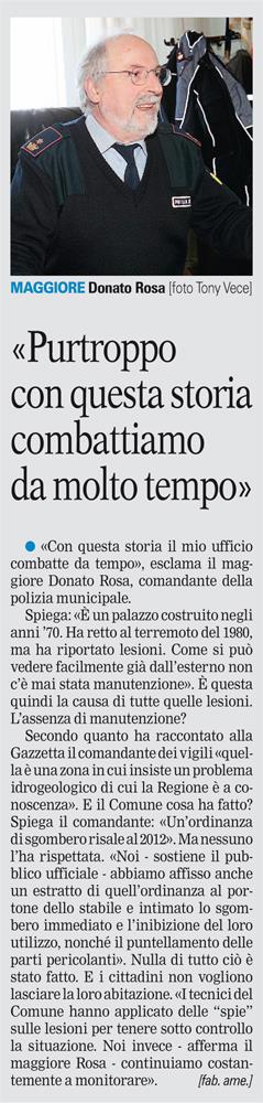 AVIGLIANO. I tecnici le avevano definite «condizioni statiche precarie». «Ma ora sono peggiorate», spiega il sindaco in un’ordinanza di sgombero emessa due anni fa. Dopo due anni il condominio del civico «179» di via Roma ad Avigliano con molta probabilità rischia di collassare. Ma le famiglie, nonostante l’ordinanza di sgombero e una denuncia in Procura, non vogliono andare via. Preferiscono rischiare la propria vita ogni giorno pur di non lasciare la propria casa. La tragedia di vico Piave a Matera, nella quale sono morte due persone, sembra non aver insegnato nulla. «Ma dobbiamo proprio andare via?», si chiede una signora uscendo dal panificio a pian terreno. Una crepa lunga oltre un metro sovrasta la porta d’in - gresso dell’attività commerciale. Ma è quella più lieve. Basta varcare l’ing resso per rendersene conto. L’o rd i n a n z a del sindaco Vito Summa è incollata al portone del palazzo: «Questo stabile versa in precarie condizioni di stabilità. Si diffida chiunque ad accedere». Intonaco caduto, muratura in bella vista. E lesioni. «Vanno da pochi centimetri a oltre un metro», spiega un tecnico che qualche anno fa si è occupato del caso. In alcuni punti la muratura si è distaccata. Ci sono lesioni gravissime nelle abitazioni. Tra il pavimento e un muro portante si è creato un distaccamento di oltre due centimetri. E alcune crepe sono talmente larghe da sembrare feritoie: permettono di guardare all’ester no. Sul ballatoio di uno dei piani intermedi c’è un avvallamento e basta poggiare un piede per avvertire la sensazione di camminare su qualcosa di fragile. Sul social-network Facebook qualche ex condomino ha «postato» alcune foto, rendendo pubblico il pericolo che ha scelto di vivere chi, invece, è rimasto in quelle case. I carabinieri del comando stazione di Avigliano hanno chiesto ufficialmente informazioni all’ammi - nistrazione. In Procura c’è una segnalazione per sette persone che non avrebbero rispettato l’ordinanza di sgombero, per un tecnico comunale e per un ufficiale della polizia municipale. Perché nessuno ha mai provveduto neppure al puntellamento delle parti pericolanti che affacciano su via Roma, una delle strada principali del paese. La scorsa estate i vigili hanno vietato alla processione di passare sotto quei balconi, deviandone il percorso. L’ordi - nanza, insomma, non è stata rispettata in nessuno dei suoi punti. E chi avrebbe dovuto vigilare non lo ha fatto. |