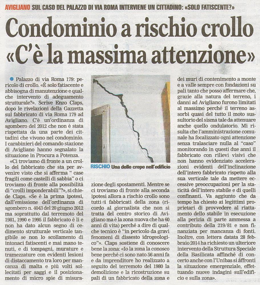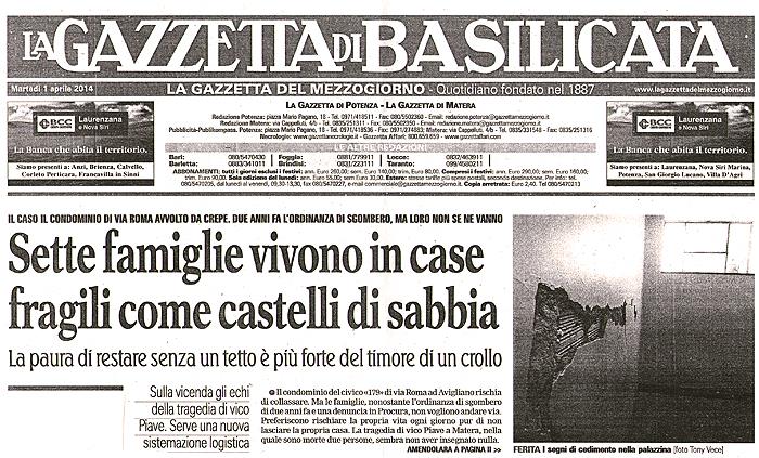 Palazzo di via Roma 179 – pericolo di crollo o è solo fatiscente e abbisogna di manutenzione e qualche intervento di adeguamento strutturale? Ho letto l’articolo in prima pagina della Gazzetta di Basilicata del 1° aprile (e non è un pesce d’aprile) a firma di F, Amendolara che titola: “Avigliano - sette famiglie vivono in case fragili come castelli di sabbia” e sottotitola “il caso - il condominio di via Roma avvolto da crepe. Due anni fa l’ordinanza di sgombero, ma loro non se ne vanno - la paura di restare senza tetto è più forte del timore di crollo” continua il sottotitolo “sulla vicenda gli echi della tragedia di vico Piave. Serve una nuova sistemazione logistica”. Questo si legge sulla prima pagina. All’interno del giornale troviamo l’articolo con titoloni ancora più altisonanti: “ Il palazzo cede, ma loro non lasciano”, “ordinanza di sgombero non rispettata, interviene la Procura. Indagano i carabinieri” continuano i sotto titoli: “condizioni precarie – i tecnici le hanno definite “condizioni statiche precarie”. Ma nessuno sembra preoccuparsi più di tanto”. E ci mette del suo oltre al sottotitolo anche le dichiarazioni del comandante della locale polizia comunale: “Purtroppo con questa storia combattiamo da molto tempo” vuoi vedere che senza sapere il comandante ci ha “azzeccato”? Ma il titolo che mi ha lasciato interdetto ed esterrefatto è questo: “ quella zona del centro storico messa in pericolo da gravi fenomeni di dissesto idrogeologico – il problema è stato segnalato sulle pagine della “Gazzetta” da tempo. Ancora nessun intervento” (il seguito lo leggete nel PS). Dopo aver letto anche il contenuto dell’articolo concatenato alle varie dichiarazioni, direbbe Lubrano, la domanda multipla nasce spontanea: Ci troviamo di fronte a un crollo del fabbricato che sta per avvenire visto che si afferma “case fragili come castelli di sabbia” o ci troviamo di fronte alla possibilità di “crolli imponderabili”? Se è la prima ipotesi, dall’emissione dell’ordinanza di sgombero n. 4043 del 20 giugno 2012 ma soprattutto dal terremoto del 1981, 1990 e 1995 il fabbricato è li e non ha dato alcun segno di cedimento strutturale verticale tangibile se non lo scollamento di intonaci fatiscenti e mai mano tenuti, e di tompagni, murature e tramezzature con evidenti lesioni di distaccamento tra loro per mancanza di malta e più volti sollecitati per saggi e il posizionamento di micro spie di misurazione degli spostamenti. Mentre se ci troviamo di fronte alla seconda ipotesi allora a rischio crollo sono tutti i fabbricati della zona ( ricordo al giornalista che non si tratta del centro storico di Avigliano ma è la zona nuova che ha 60 anni di vita) perché a dire di qualche tecnico è “in pericolo da gravi fenomeni di dissesto idrogeologico”. Io la zona la conosco bene perché ci sono nato 56 anni fa e da imprenditore ho realizzato a seguito del terremoto del 1980 la demolizione e la ricostruzione su pali di un fabbricato della zona e dei muri di contenimento a monte e a valle sempre con fondazioni su pali tanto che posso affermare che, grazie alla natura del terreno, i danni ad Avigliano furono limitati al massimo perché il terreno assorbì quasi del tutto il moto sussultorio del sisma tale da attenuare anche quello ondulatorio. Mi risulta che l’amministrazione comunale ha focalizzato ogni attenzione senza tralasciare nulla al “caso” monitorando in questi due anni il fabbricato con rilievi visivi che non hanno evidenziato accelerazioni evidenti dell’inclinazione dell’intero fabbricato rispetto alla sua verticale tale da mettere eccessive preoccupazioni per la staticità dell’intero stabile e di quelli confinanti. Va aggiunto che da tempo ha chiesto ai legittimi proprietari di provvedere al riattamento dello stabile in esecuzione alla perizia di parte ammessa a contributo della 219/81 e non finanziata per mancanza di fonti. Inoltre, con lettera datata 28 febbraio 2014 ha richiesto un ulteriore intervento della Struttura Speciale della Basilicata affinché di concerto anche con l’UNIBAS si affronti la situazione emergenziale, effettuando nuove indagini sull’edificio e sulla zona. Senza polemica, per il futuro ovviamente senza mai omettere la verità è opportuno prestare un po’ più d’attenzione tanto da evitare il diffondersi del cosi detto procurato allarmee onde evitare che gli organi di informazione si facciano cassa di risonanza di tale procurato allarme. PS Come ho detto sopra, una risposta a parte e più circostanziata meritano questi titoli del giornale: “quella zona del centro storico messa in pericolo da gravi fenomeni di dissesto idrogeologico – il problema è stato segnalato sulle pagine della “Gazzetta” da tempo. Ancora nessun intervento”. Si ricorda al giornalista che in riguardo al “Ancora nessun intervento” invece tanto si è fatto e con i decreti n. 517 del 28 novembre 2013 n. 19 del 16 gennaio 2014 il Commissario Straordinario delegato per la realizzazione degli interventi di mitigazione del rischio idrogeologico per la regione Basilicata (D.P.G.M. 21 gennaio 2011) a seguito dell’accordo di Programma del 14 dicembre 2010 tra il Ministero dell’Ambiente e la Regione Basilicata, finalizzato alla programmazione e al finanziamento di interventi urgenti e prioritari per la mitigazione del rischio idrogeologico. Lavori di “Sistemazione idrogeologica zona a valle della villa comunale e viale della Vittoria (ora viale Verrastro)” ha individuato come area prioritaria quella a ridosso di via G. Fortunato e non quella di viale Verrastro a ridosso del fabbricato incriminato e ha appaltato i lavori per un importo complessivo di €300.000, appalto che si è aggiudicato la ditta “Arcasensa Agostino sas” con un ribasso del 33,456%. Link articolo Gazzetta del Mezzogiorno - Fabio Amendolara del 01/04/2014 IL PALAZZO CEDE, MA LORO NON LASCIANO |