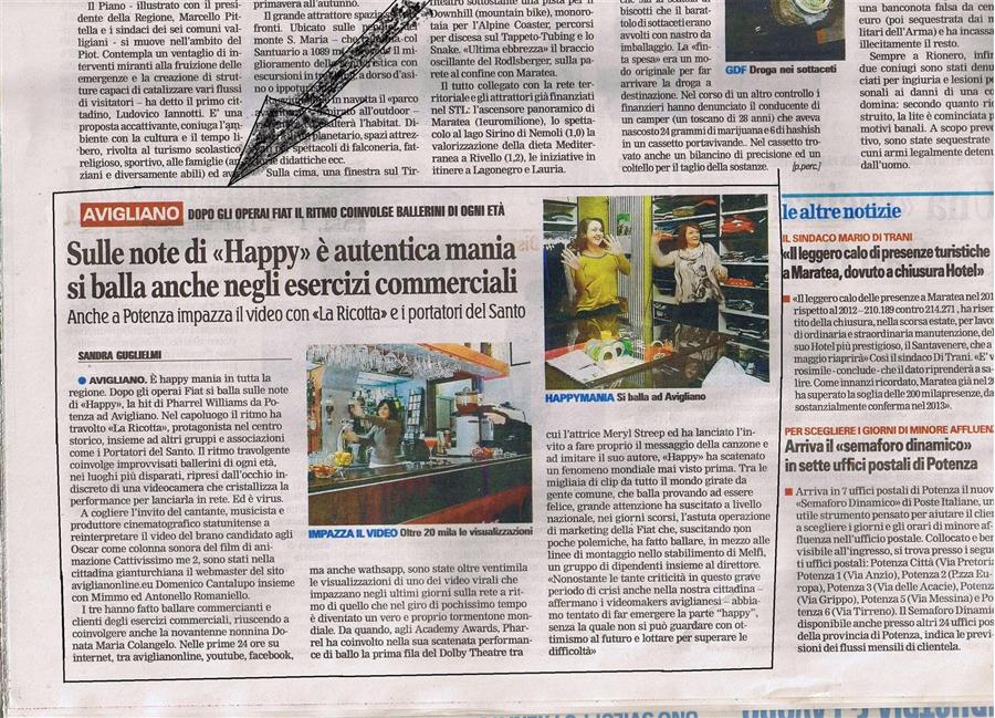 AVIGLIANO - E' happy mania in tutta la regione. Dopo gli operai Fiat si balla sulle note di Happy, la hit di Pharrel Williams da Potenza ad Avigliano. Nel capoluogo il ritmo ha travolto , protagonista, nel centro storico, insieme ad altri gruppi e associazioni come i Portatori del Santo. Il ritmo travolgente coinvolge improvvisati ballerini di ogni età, nei luoghi più disparati, ripresi dall'occhio indiscreto di una videocamera che cristallizza la performance per lanciarla in rete. Ed è virus. A cogliere l’invito del cantante, musicista e produttore cinematografico statunitense a reinterpretare il video del brano candidato agli Oscar come colonna sonora del film di animazione Cattivissimo me 2, sono stati nella cittadina gianturchiana il webmaster del sito aviglianonline.eu Domenico Cantalupo insieme con Mimmo ed Antonello Romaniello e Giordano Leoanrdo. I quattro hanno fatto ballare commercianti e clienti degli esercizi commerciali, riuscendo a coinvolgere anche la novantenne nonnina Donata Maria Colangelo. Nelle prime 24 ore su internet, tra aviglianonline, youtube, facebook, ma anche wathsapp, sono state migliaia le visualizzazioni di uno dei video virali che impazzano negli ultimi giorni sulla rete a ritmo di quello che nel giro di pochissimo tempo è diventato un vero e proprio tormentone mondiale. Da quando, agli Academy Awards, Pharrel ha coinvolto nella sua scatenata performance di ballo la prima fila del Dolby Theatre tra cui l’attrice Meryl Streep e all’indomani dell'invito a fare proprio il messaggio della canzone e ad imitare il suo autore, «Happy» ha scatenato un fenomeno mondiale mai visto prima. Tra le migliaia di clip da tutto il mondo girate da gente comune, che balla provando ad essere felice, grande attenzione ha suscitato a livello nazionale, nei giorni scorsi, l’astuta operazione di marketing della Fiat con il video di Happy, che ha suscitato non poche polemiche, girato proprio in Basilicata, nello stabilimento di Melfi, dove un gruppo di dipendenti, insieme al direttore, ballano in mezzo alle linee di montaggio. «Nonostante le tante criticità in questo grave periodo di crisi anche nella nostra cittadina - affermano i videomakers aviglianesi - abbiamo tentato di far emergere la parte “happy”, senza la quale non si può guardare con ottimismo al futuro e lottare per superare le difficoltà» |