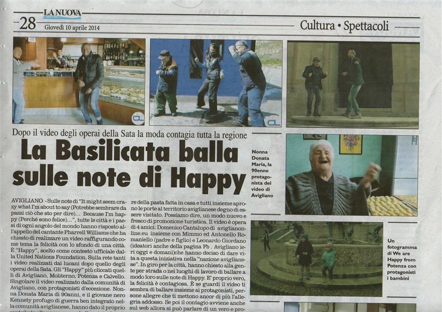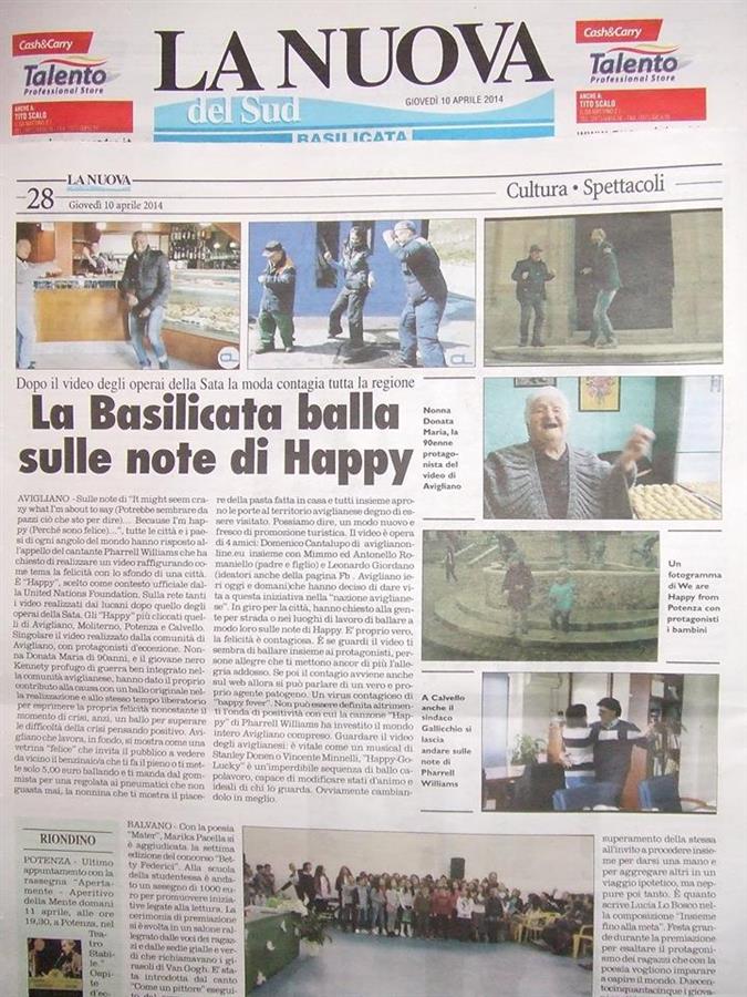 AVIGLIANO - Sulle note di “It might seem crazy what I’m about to say (Potrebbe sembrare da pazzi ciò che sto per dire)… Because I’m happy (Perché sono felice)…”, tutte le città e i paesi di ogni angolo del mondo hanno risposto all’appello del cantante Pharrell Williams che ha chiesto di realizzare un video raffigurando come tema la felicità con lo sfondo di una città. È “Happy”, scelto come contesto ufficiale dalla United Nations Foundation. Sulla rete tanti i video realizzati dai lucani dopo quello degli operai della Sata. Gli “Happy” più cliccati quelli di Avigliano, Moliterno, Potenza e Calvello. Singolare il video realizzato dalla comunità di Avigliano con protagonisti d’eccezione. Nonna Donata Maria di solo 90anni, e, con la partecipazione del giovane nero Kennedy profugo di guerra ben integrato nella comunità aviglianese, ha dato il proprio contributo alla causa con un ballo originale nella realizzazione e allo stesso tempo liberatorio per esprimere la propria felicità nonostante il momento di crisi, anzi, un ballo per superare le difficoltà della crisi pensando positivo. Avigliano che lavora, in fondo, si mostra come una vetrina “felice” che invita il pubblico a vedere da vicino il benzinaio/a che ti fa il pieno o ti mette solo 5,00 euro ballando e ti manda dal gommista per una regolata ai pneumatici che non guasta mai, la nonnina che ti mostra il piacere della pasta fatta in casa e tutti insieme aprono le porte al territorio aviglianese degno di essere visitato. Possiamo dire, un modo nuovo e fresco di promozione turistica. Il video è opera di 4 amici: Domenico Cantalupo di aviglianonline.eu insieme con Mimmo ed Antonello Romaniello (padre e figlio) e Leonardo Giordano (ideatori anche della pagina Fb . Avigliano ieri oggi e domani)che hanno deciso di dare vita a questa iniziativa nella “nazione aviglianese”. In giro per la città, hanno chiesto alla gente per strada o nei luoghi di lavoro di ballare a modo loro sulle note di Happy. E’ proprio vero, la felicità è contagiosa. È se guardi il video ti sembra di ballare insieme ai protagonisti, persone allegre che ti mettono ancor di più l’allegria addosso. Se poi il contagio avviene anche sul web allora si può parlare di un vero e proprio agente patogeno. Un virus contagioso di “happy fever”. Non può essere definita altrimenti l’onda di positività con cui la canzone “Happy” di Pharrell Williams ha investito il mondo intero Avigliano compreso. Guardare il video degli aviglianesi: è vitale come un musical di Stanley Donen o Vincente Minnelli, "Happy-Go-Lucky" è un'imperdibile sequenza di ballo capolavoro, capace di modificare stati d'animo e ideali di chi lo guarda. Ovviamente cambiandolo in meglio. |